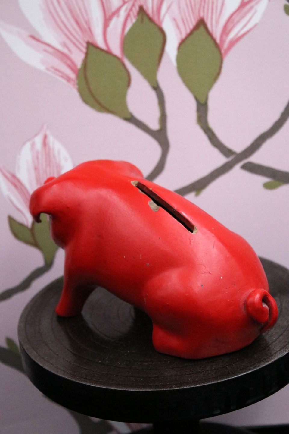 Dekorativ , gammel sparegris i rødmalet terrakotta fra 40érne med en fin patina...