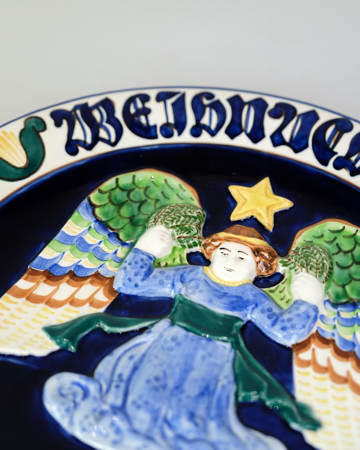 Denne juleplatte, model 974/792, er fremstillet i fajance af Aluminia og dekoreret med et elegant motiv af en engel. Plattten har et klassisk og stemningsfuldt design, der indfanger julens budskab og traditioner.