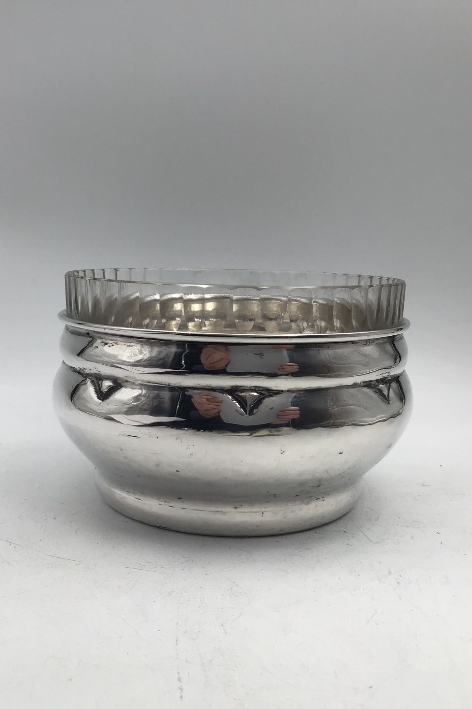 Heimbürger Sølvskål med glasindsats (1920) Måler Sølvskål H 7 cm (2.75 inch) Diam 13.5 cm (5.31 inch) Glasindsats 7 cm (2.75 inch) Diam 12 cm (4.72 inch) Samlet Vægt 407 gr (14.3 oz)