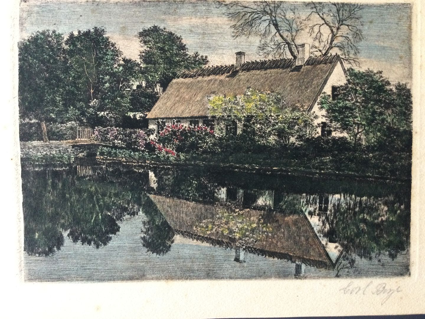Farvelitografi af Carl Boye - landsby idyl.