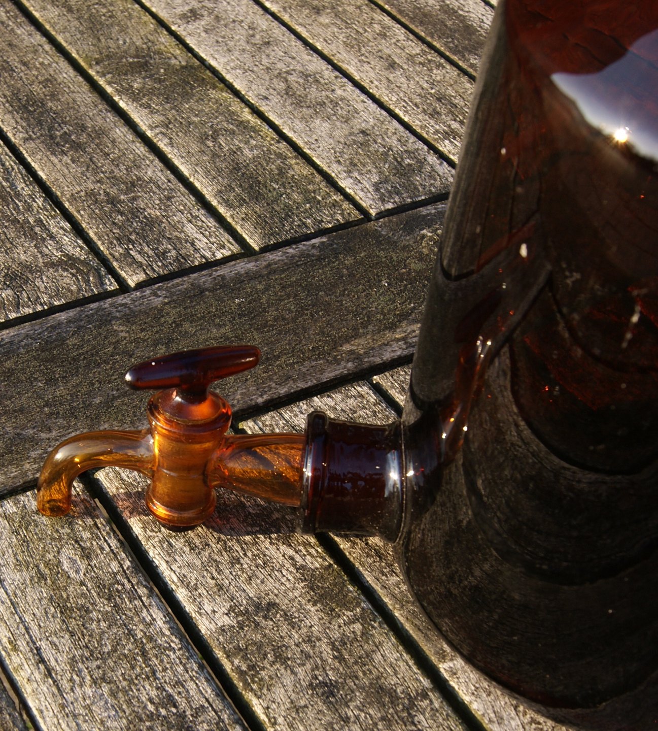 Large and well-maintained 5 liter apothecary bottle with pouring spoutin in dark brown glass. On the back there are liter measurements.