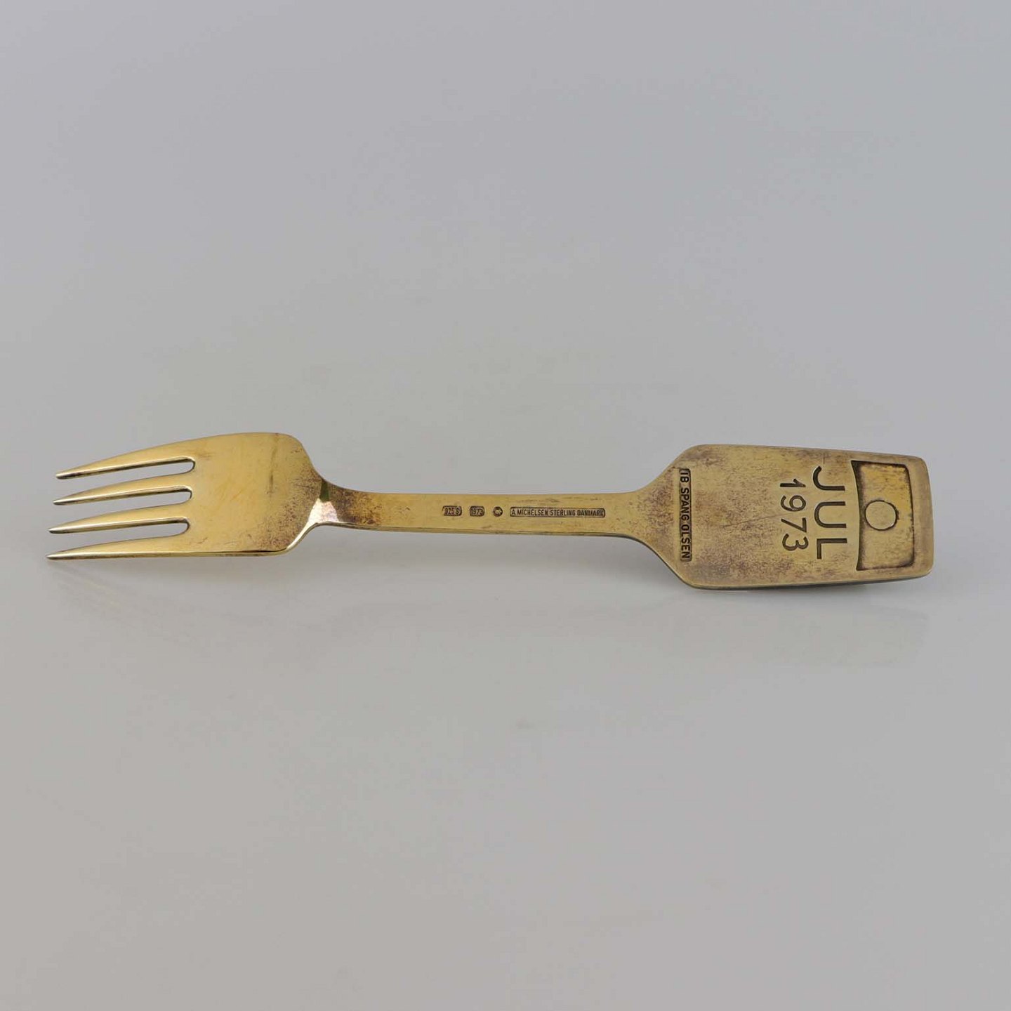 Julegaffel i forgyldt sterling sølv med indlagt emalje med teksten Jul 1973 og motiv af far, mor og barn