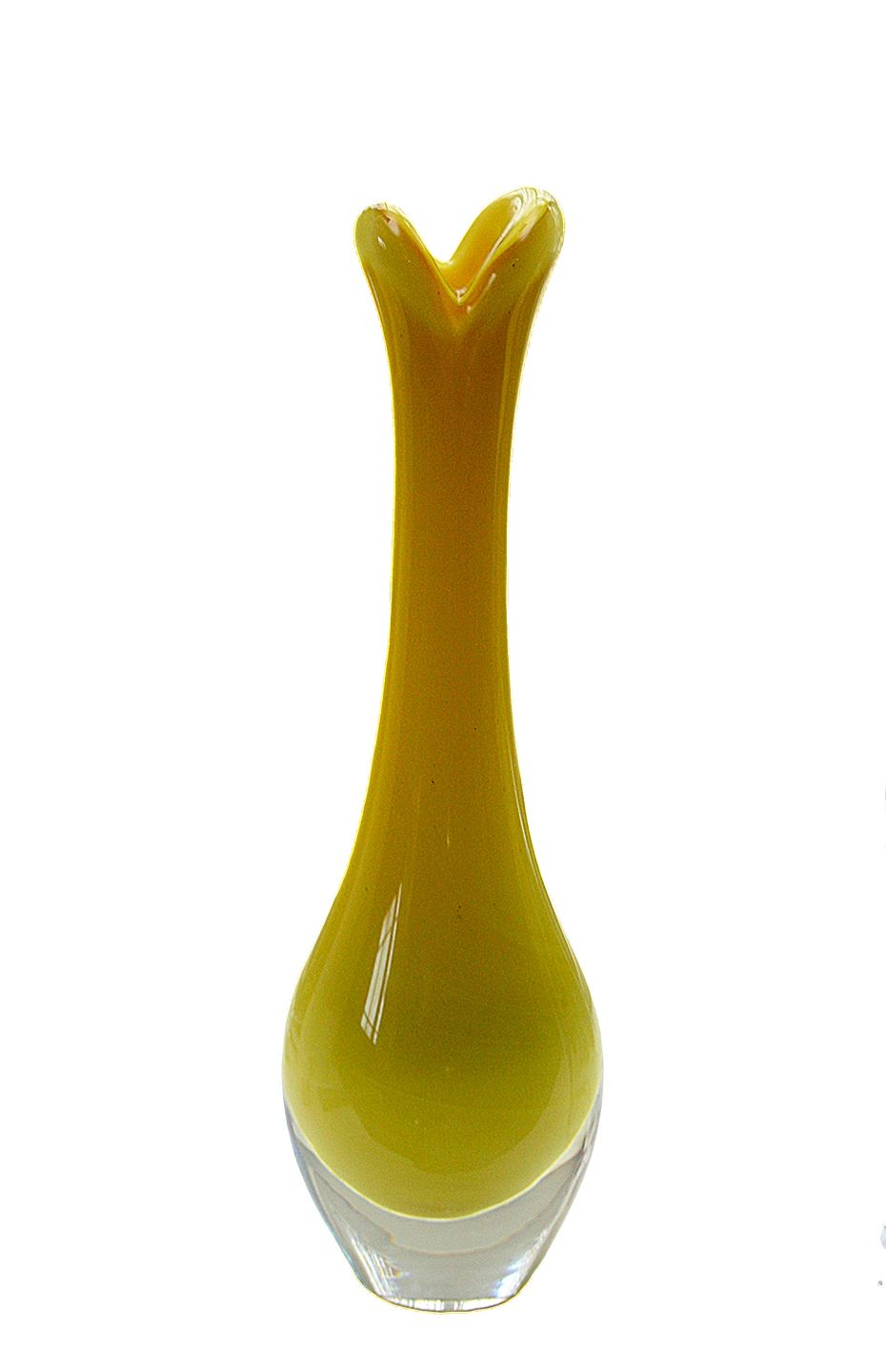 Næbvase i gennemfarvet gult glas med klar bund. Højde 26 cm. Største diameter 7 cm. Ingen signatur i bund. Flot stand. Pris: 375 kr. stk. Lager: 1