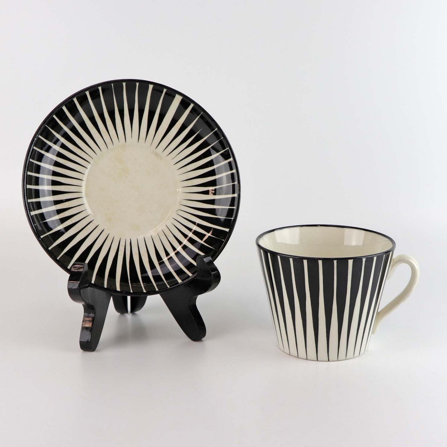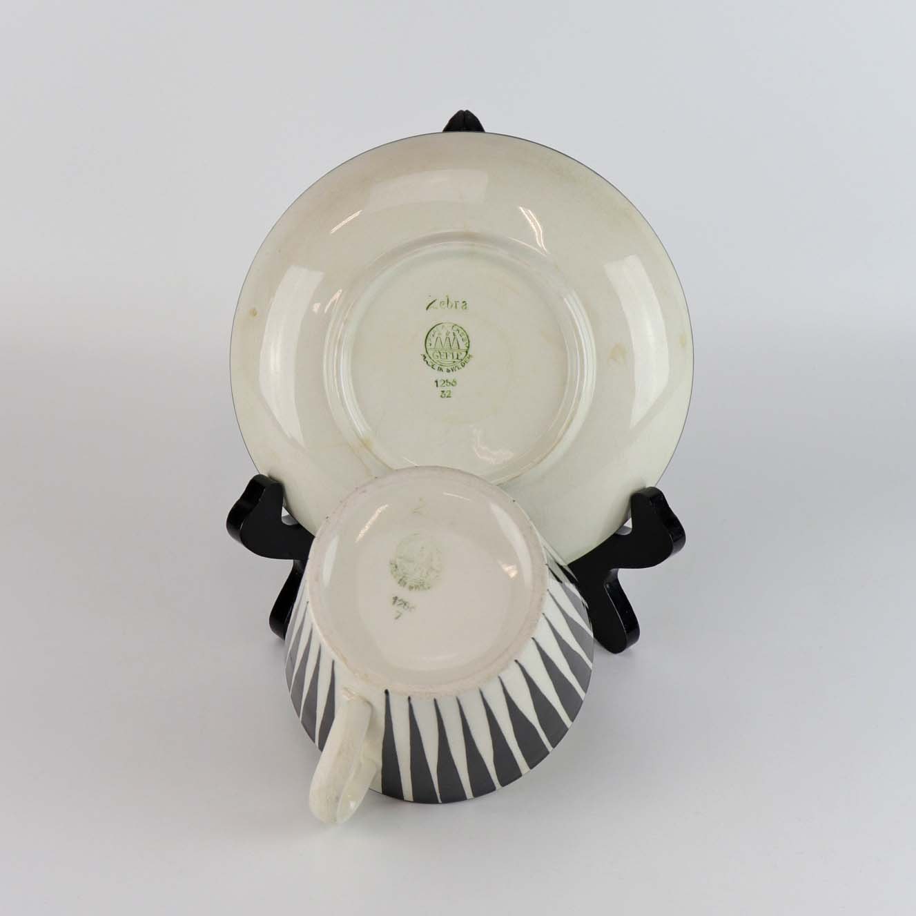 Håndmalet tekop eller chokoladekop med underkop i fajance fra stellet Zebra med mønster i sorte og hvide striber. Nr. 1256/7 og 1256/32