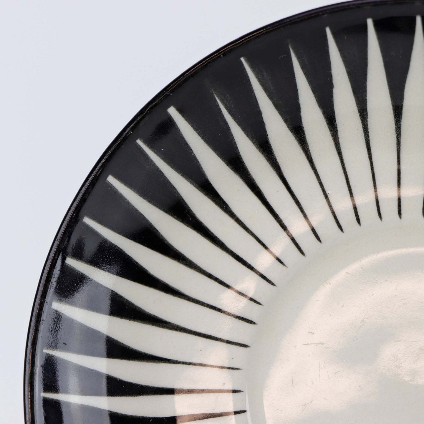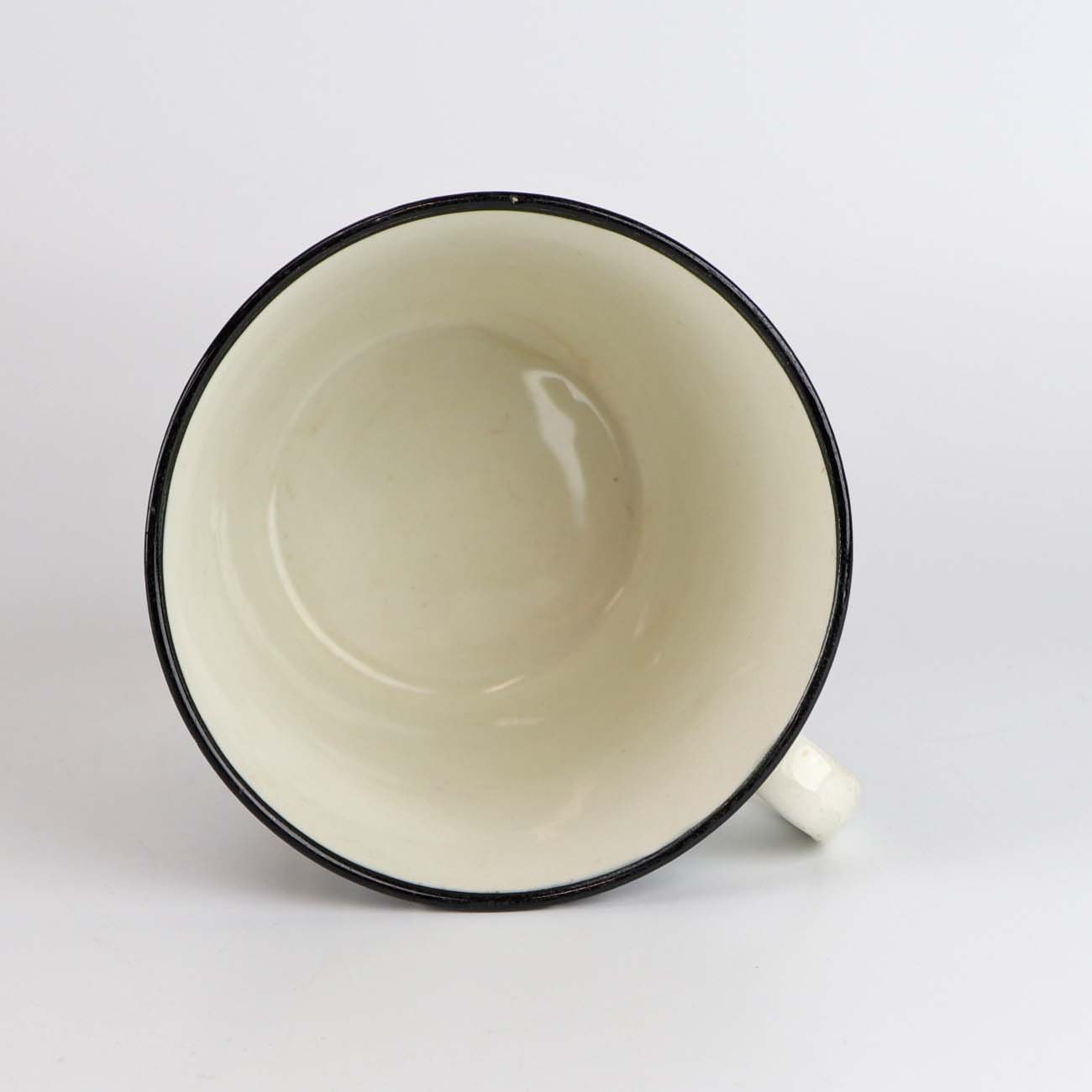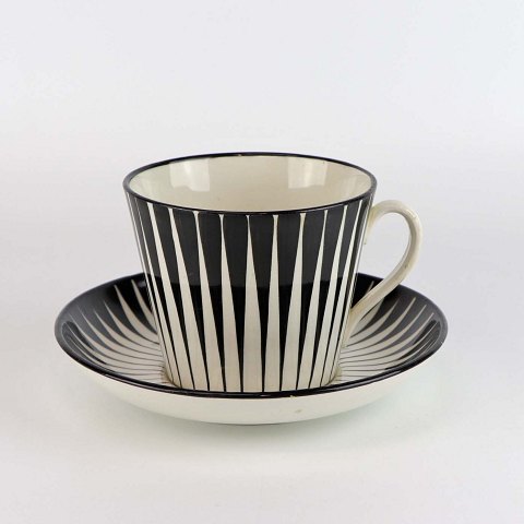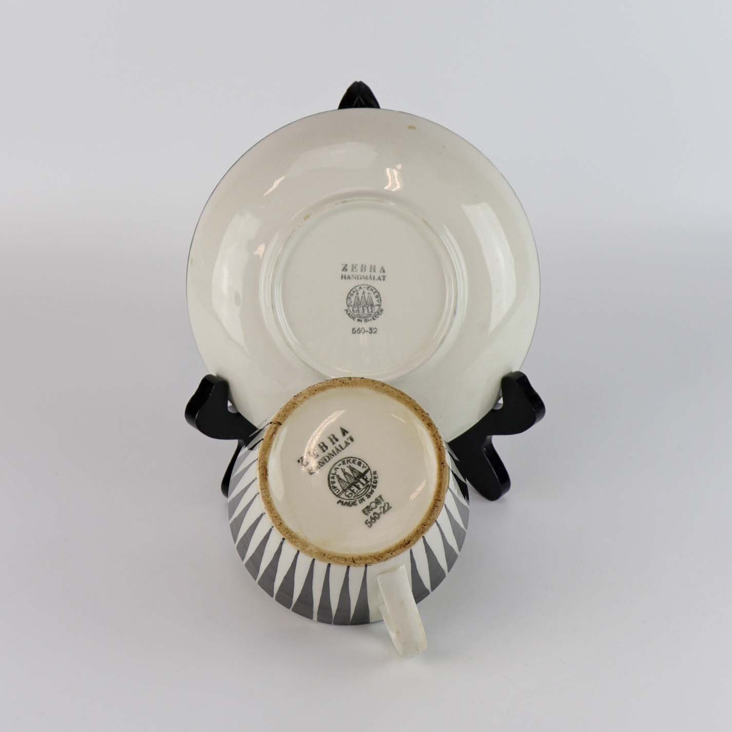 Håndmalet tekop eller chokoladekop med underkop i fajance fra stellet Zebra med mønster i sorte og hvide striber. Nr. 560/32 og 560/22