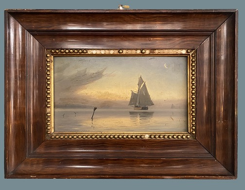 Alfred Olesen. Olie på plade. Marine, motiv af skib ved solnedgang.