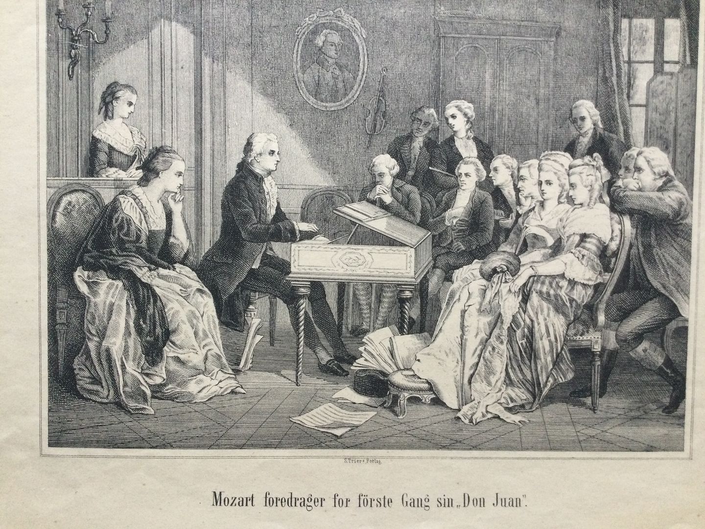 Text available in Danish: Litografi - Mozart foredrager for første gang sin "Don Juan".