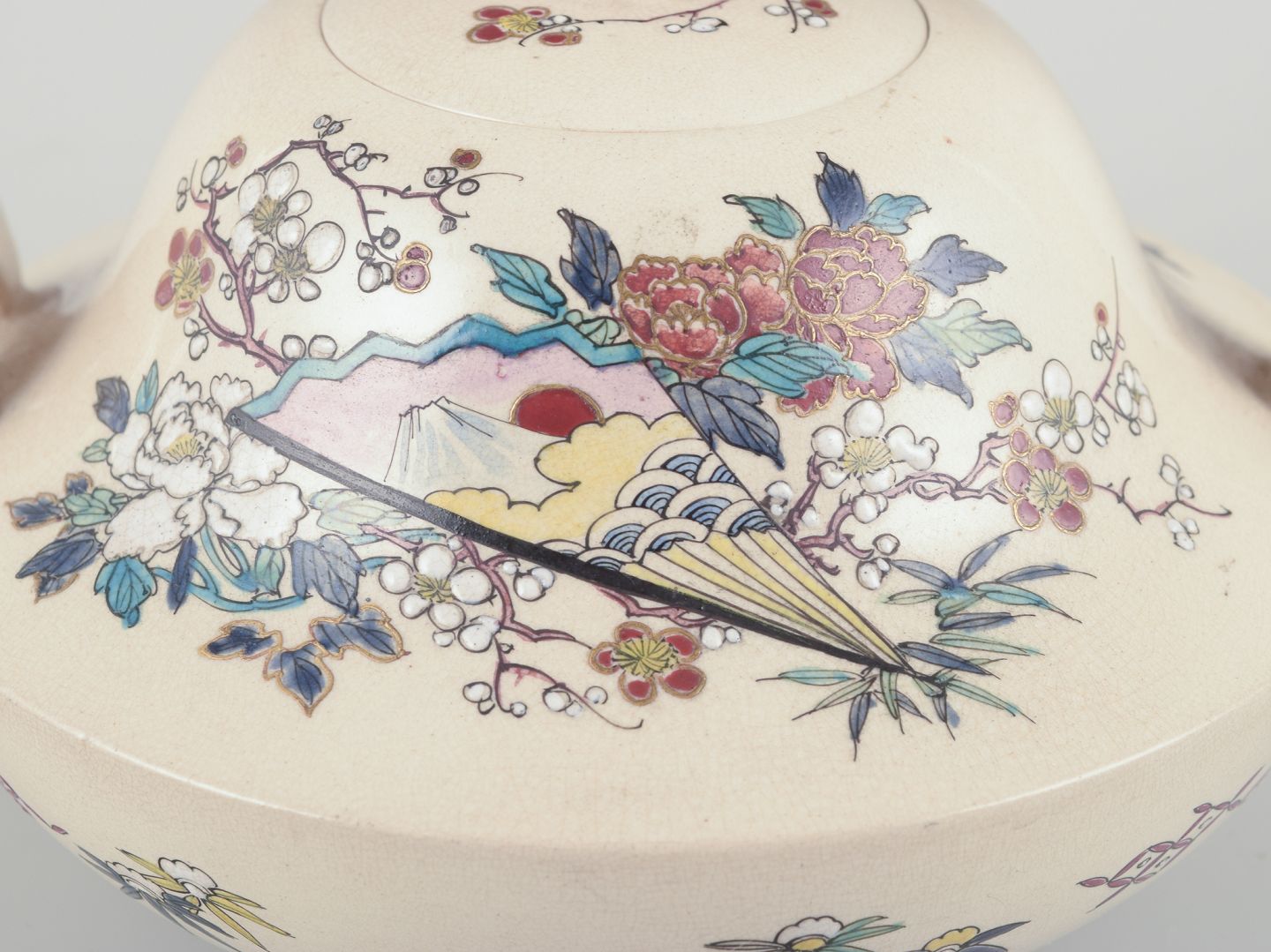 Håndmalet med blomstermotiver og vifte.