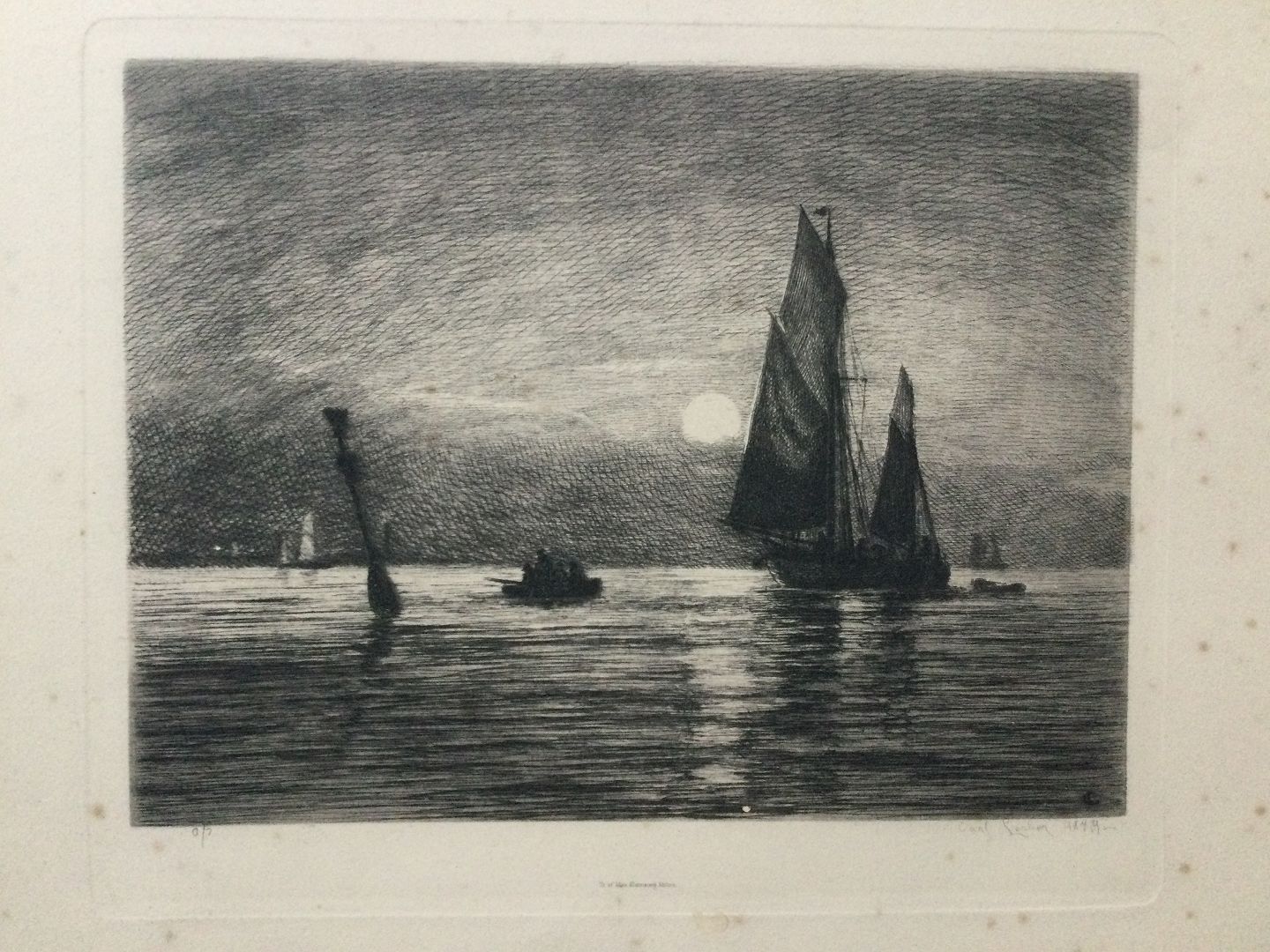 Radering af Carl Locher 1899 - Måneopgang, Skagen.