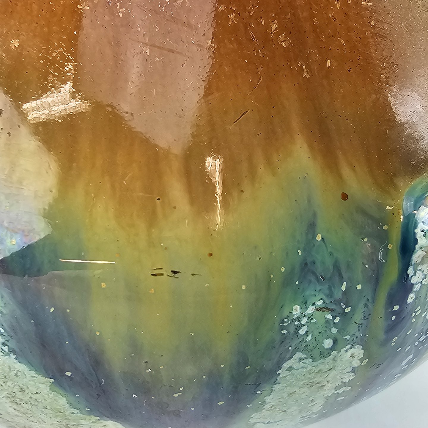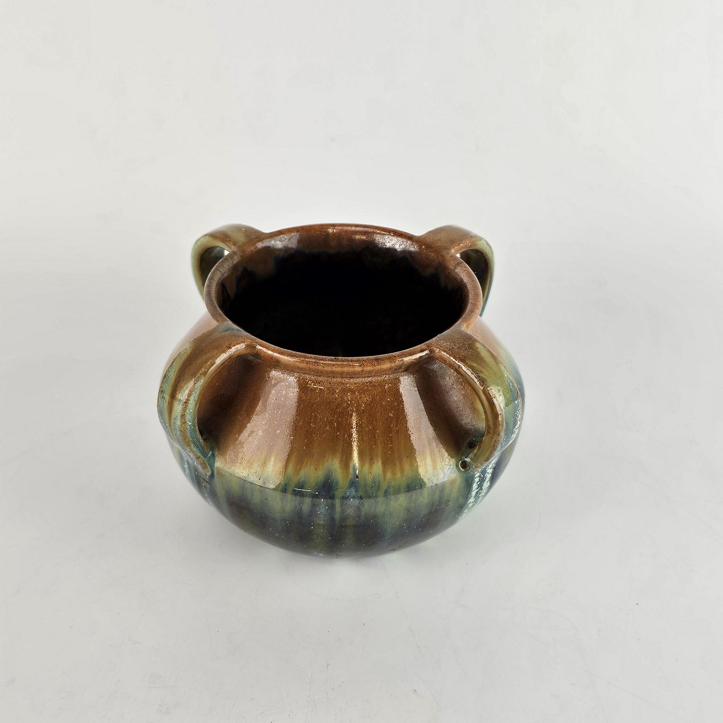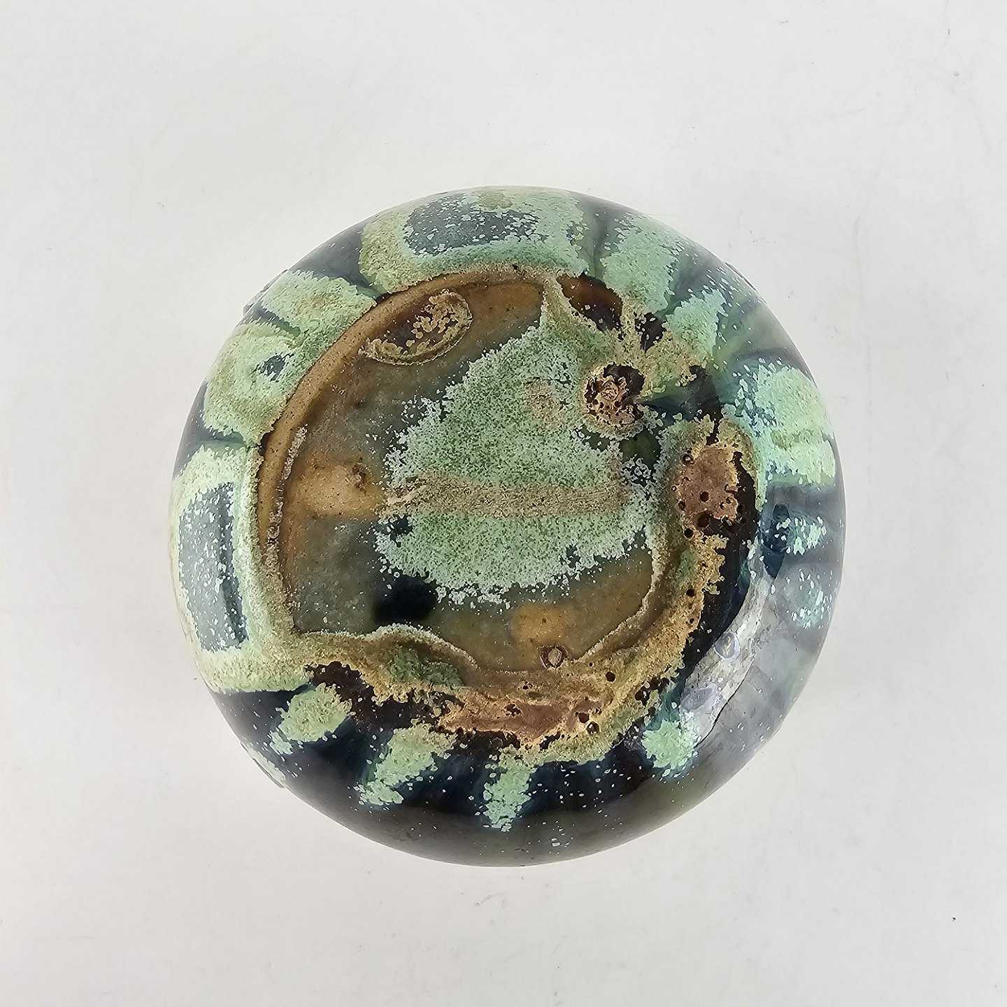 Krukke af keramik i blå, grønne og brune nuancer.
