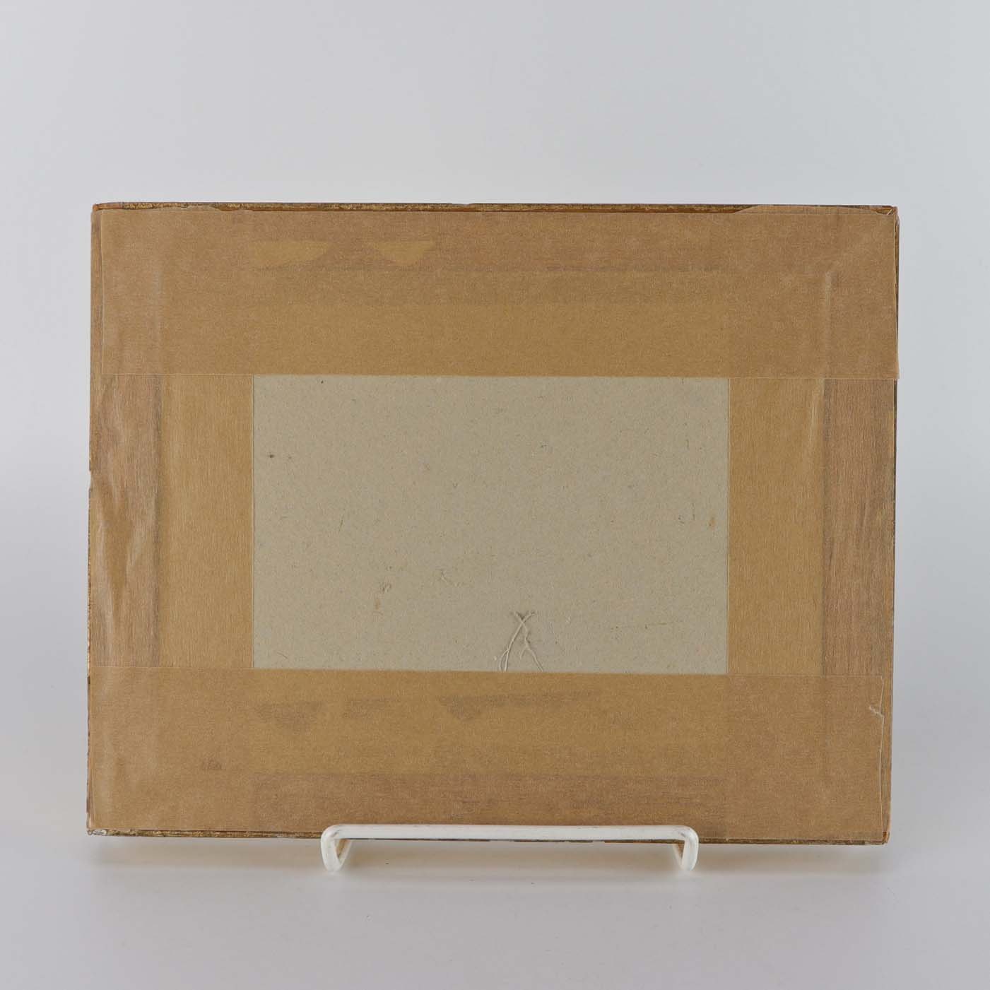 Indrammet radering på brunt papir i guldmalet træramme med landskabsmotiv af kystområde med træer og sejlskibe på havet.