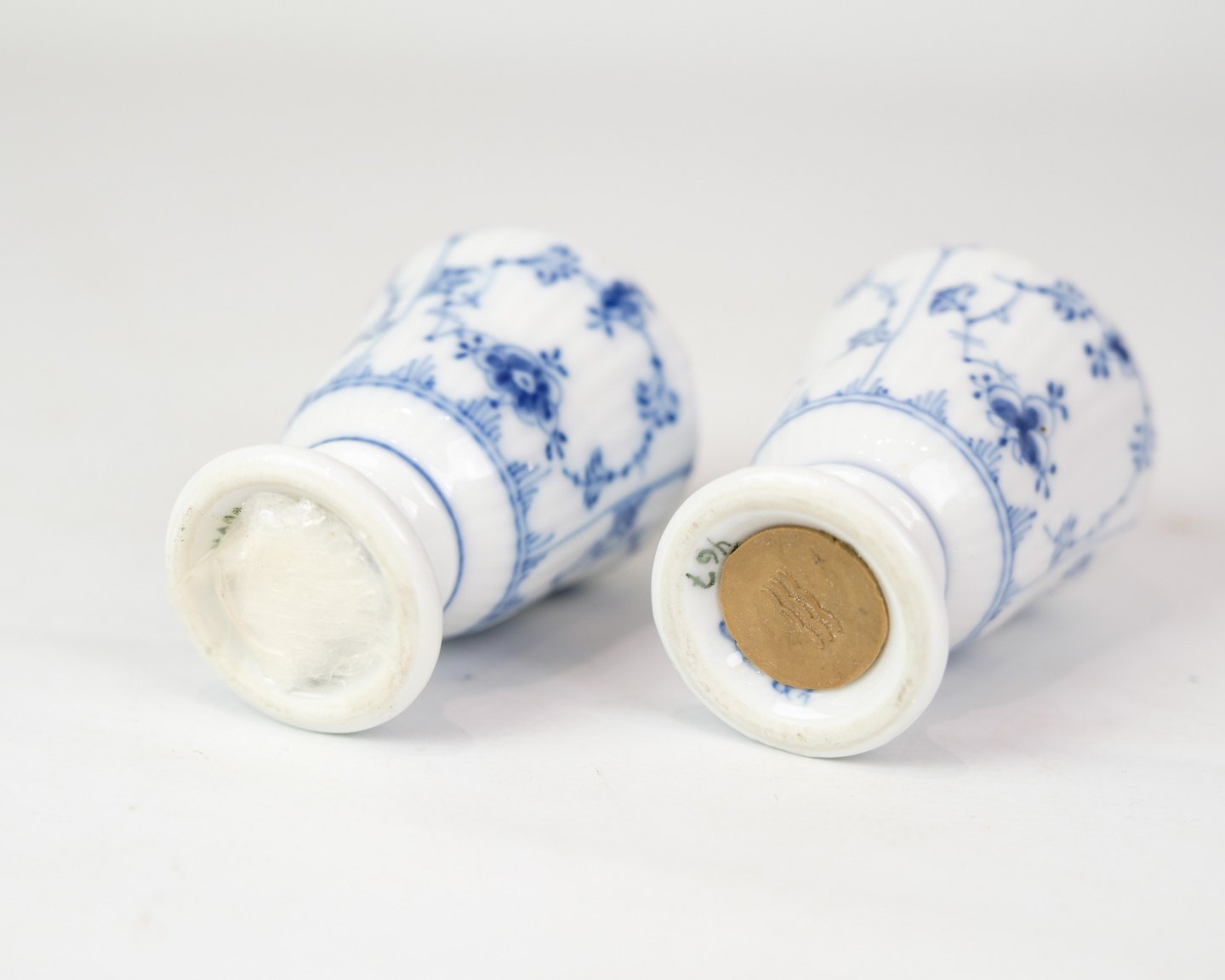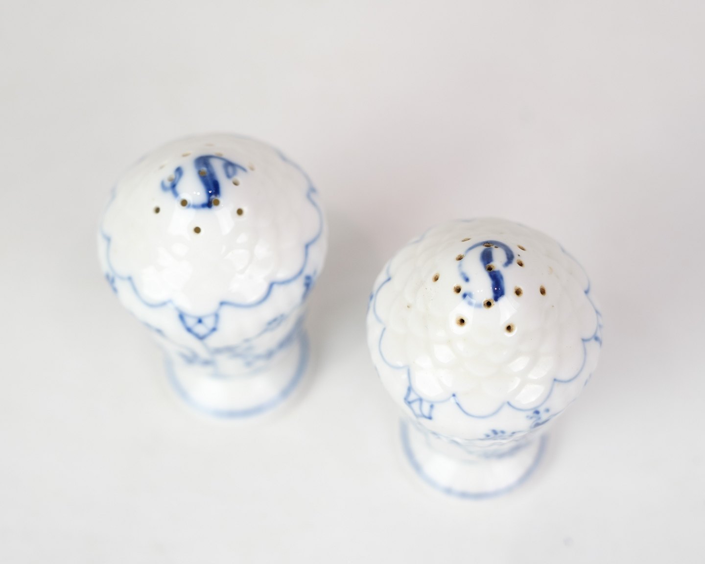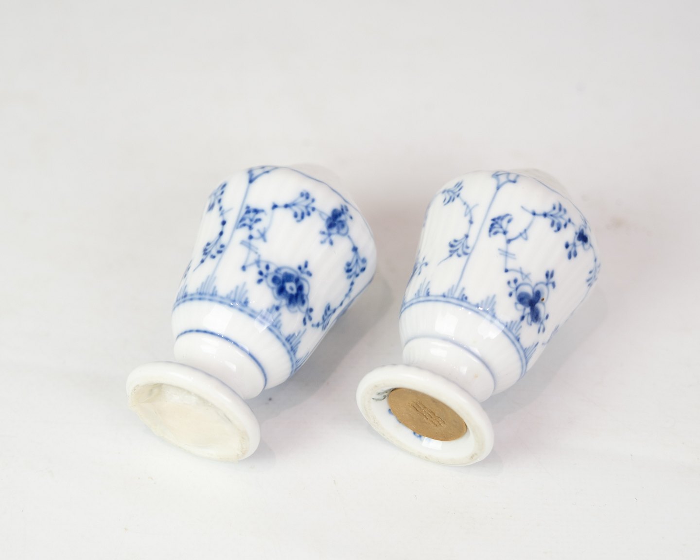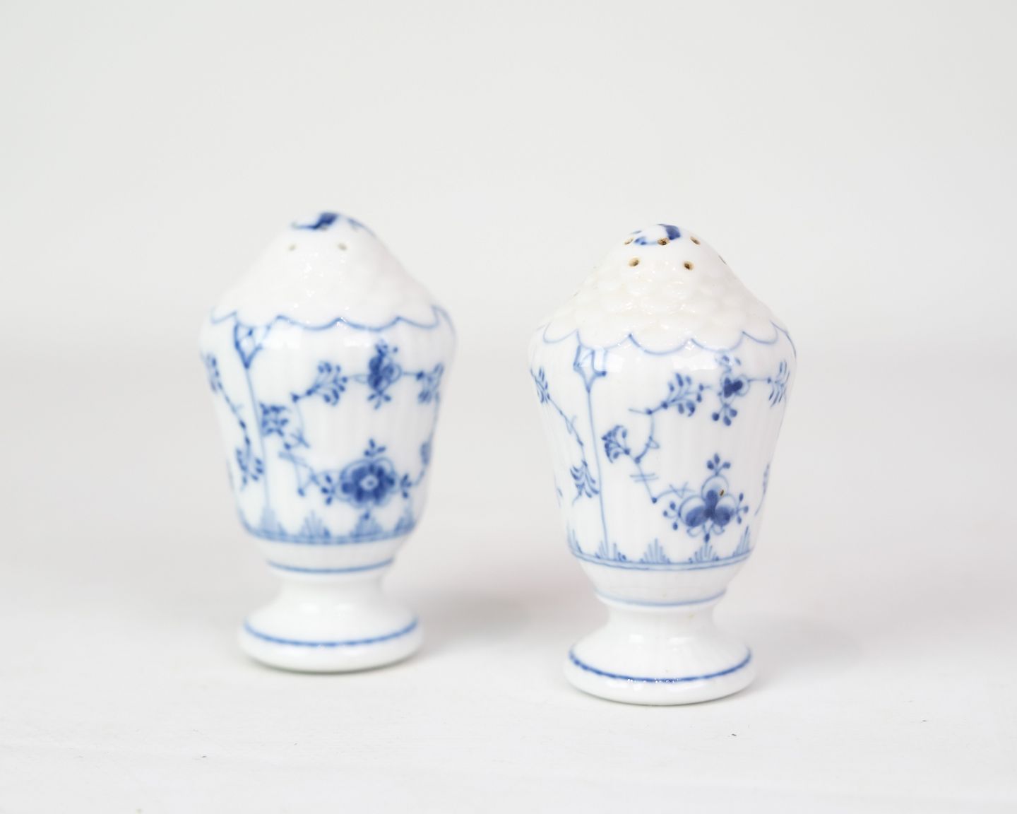 Salt and pepper shaker marked 1/467 from Royal Copenhagen. In porcelain with classic blue fluted design. Hand painted blue decoration.