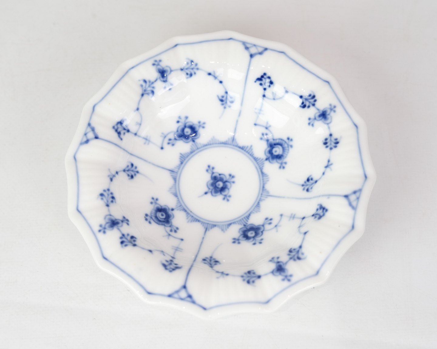 Royal Copenhagen bowl of patterned blue fluting fluted edged no. 1/140 with blue hand-painted decoration.