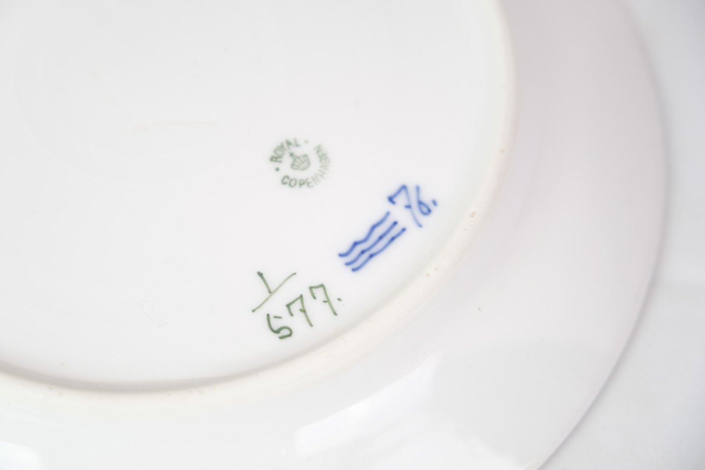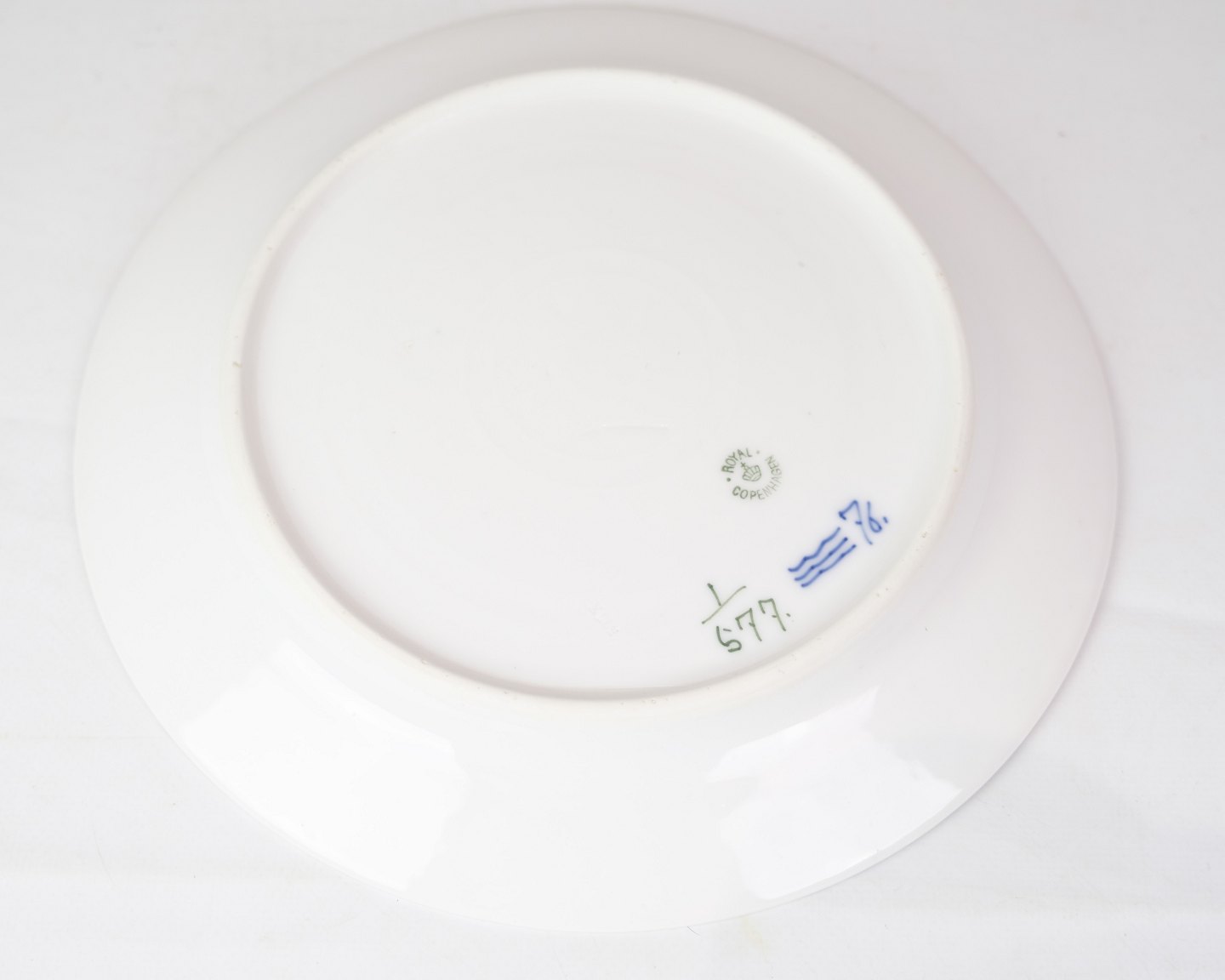 Dinner plate marked 1/577 from Royal Copenhagen. Made of porcelain with classic blue fluting half lace design. Hand painted in blue decoration.