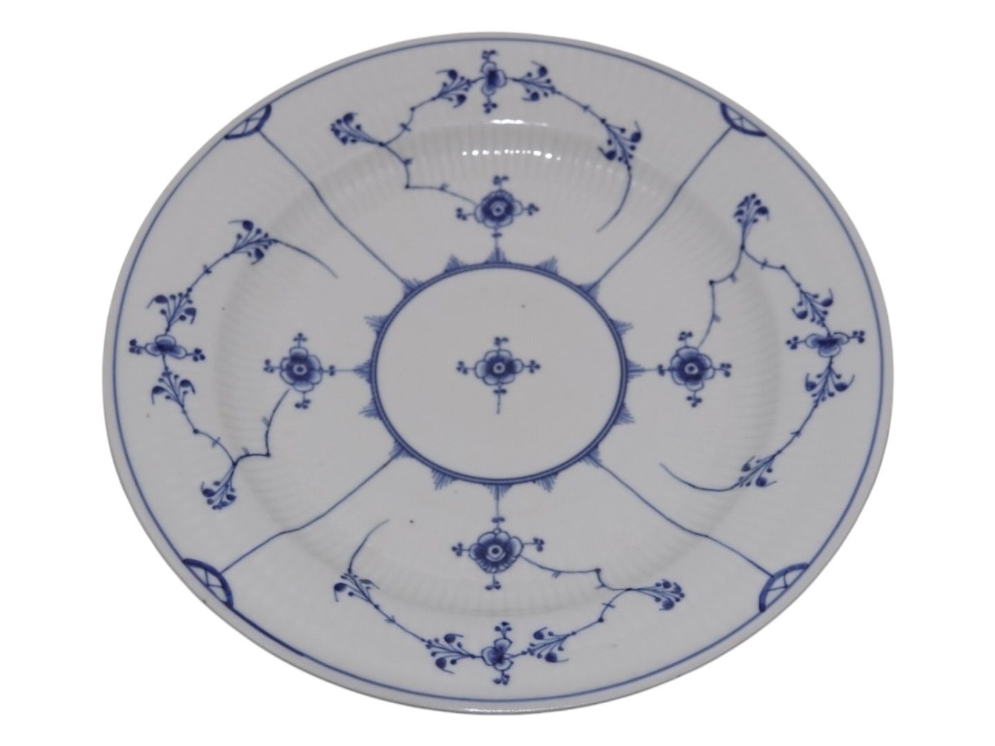 Royal Copenhagen Musselmalet Riflet, tidlig middagstallerknen der er grålig i porcelænet.