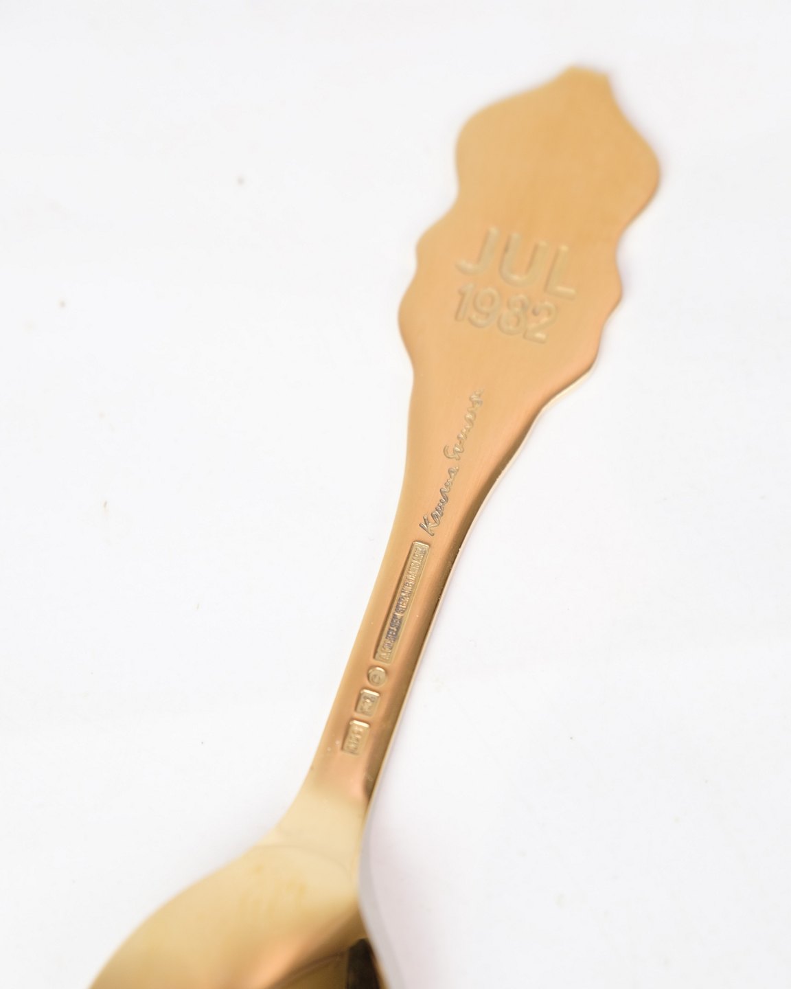 Christmas spoon made by Anton Michelsen in 1982 in Sterling Silver and gilded with enamel. The design is by Kamma Svensson, which has a motif of the Queen of Sheba in green and blue enamel color.