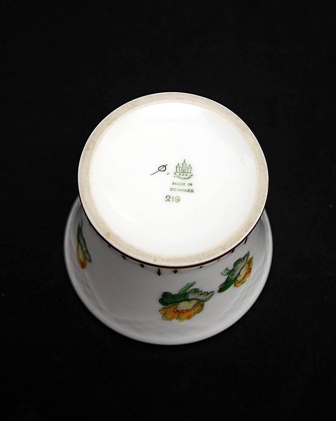 Bing & Grøndahl, Erantis, Lille vase eller bæger. Nr. 219. Højde 7 cm. Øverste diameter 8,5 cm. I. sortering. God stand med lidt slitage i guldkant øverst. Pris: 150 kr. stk. Lager: 1
