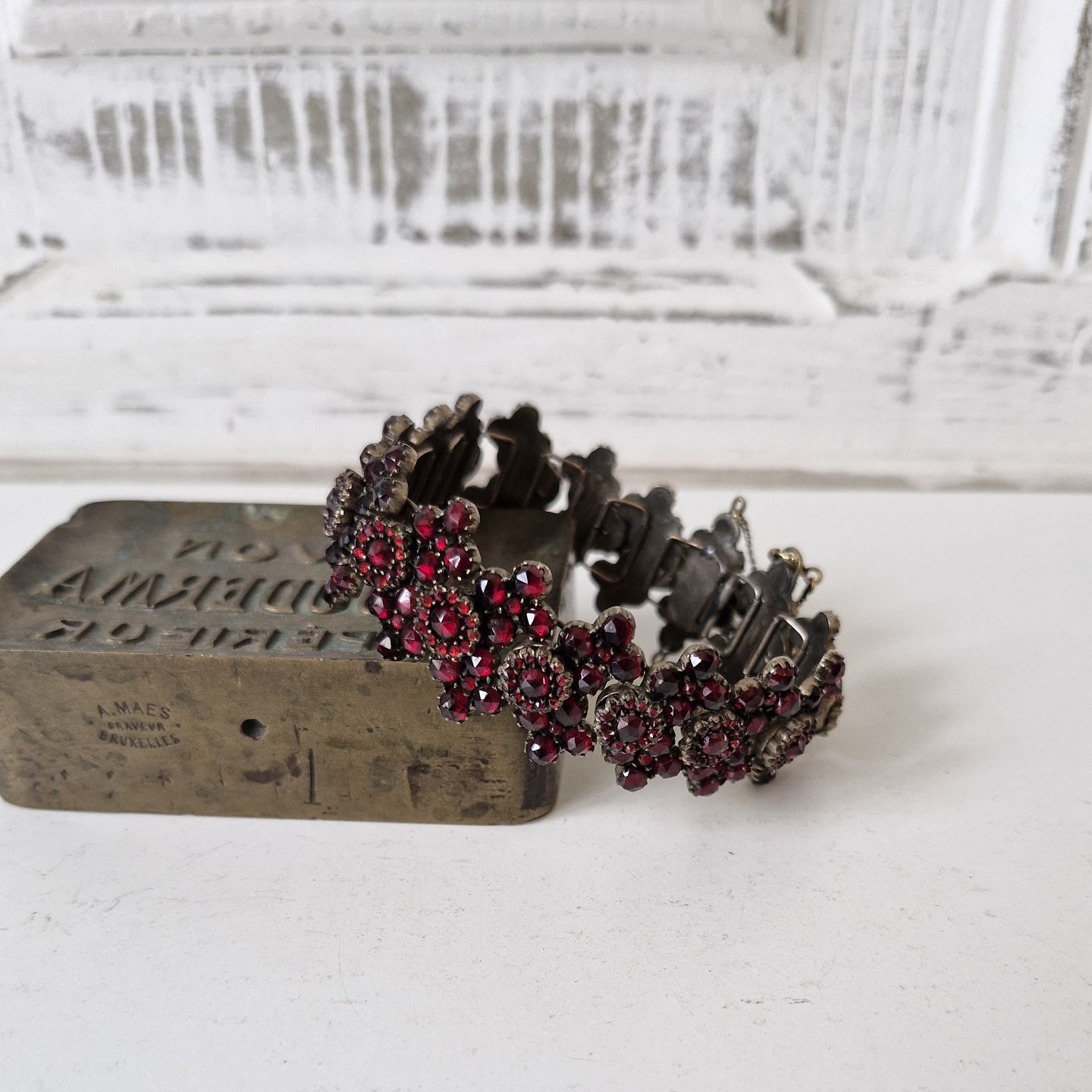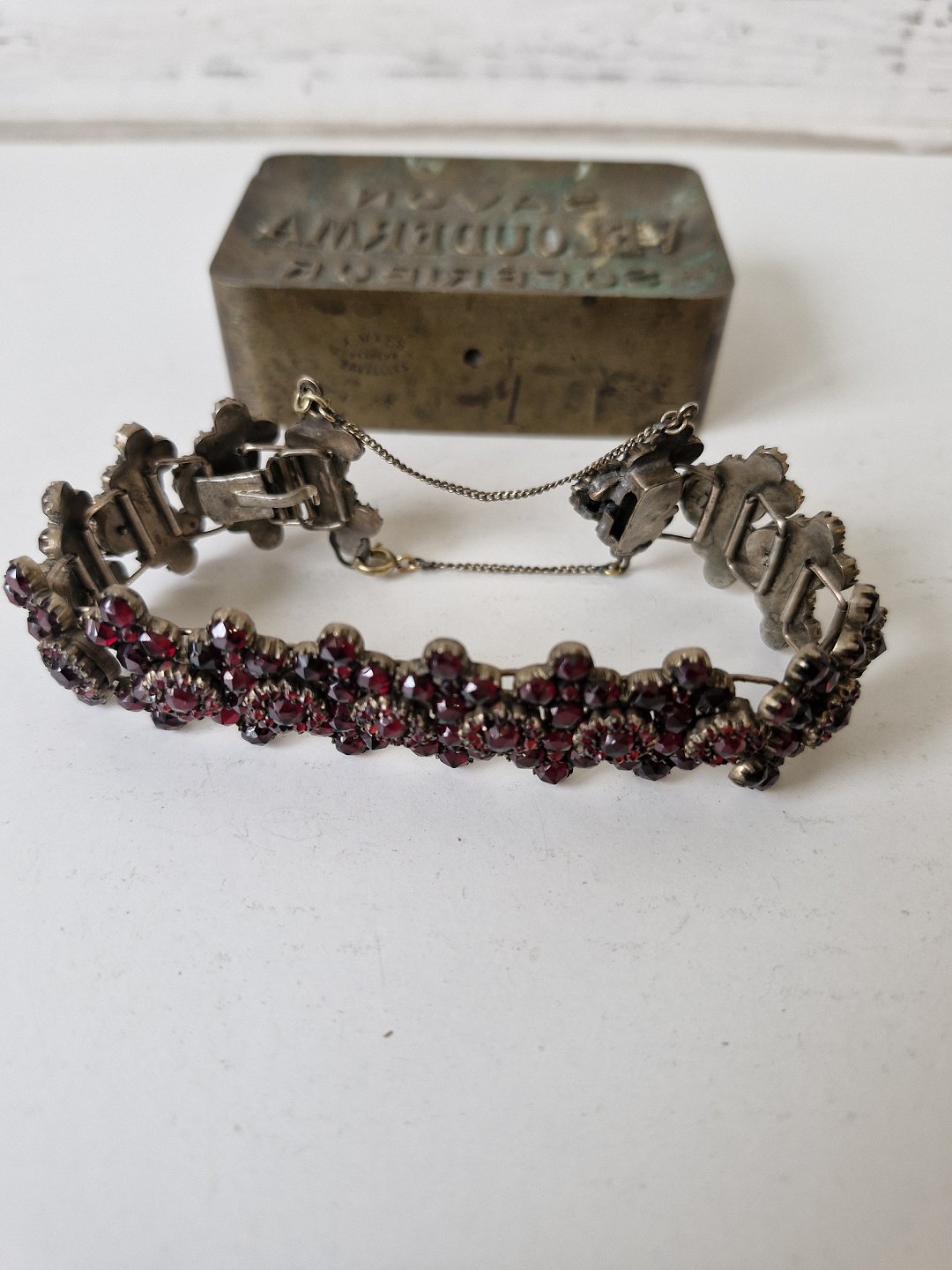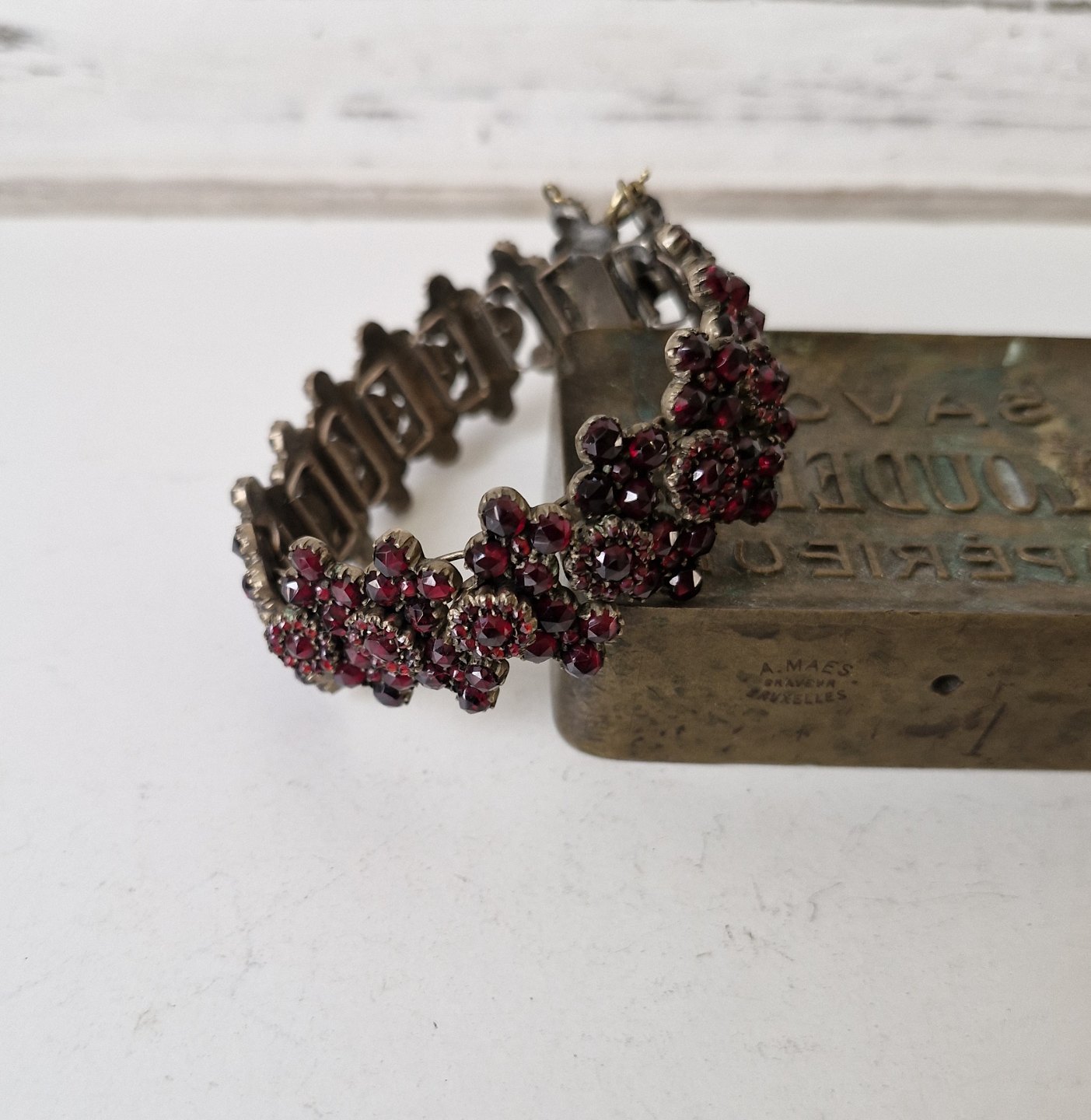 Very beautiful Victorian garnet bracelet. Circa 1860-80. Linked bracelet adorned with numerous beautiful dark garnets, the bracelet is equipped with safety chains.
