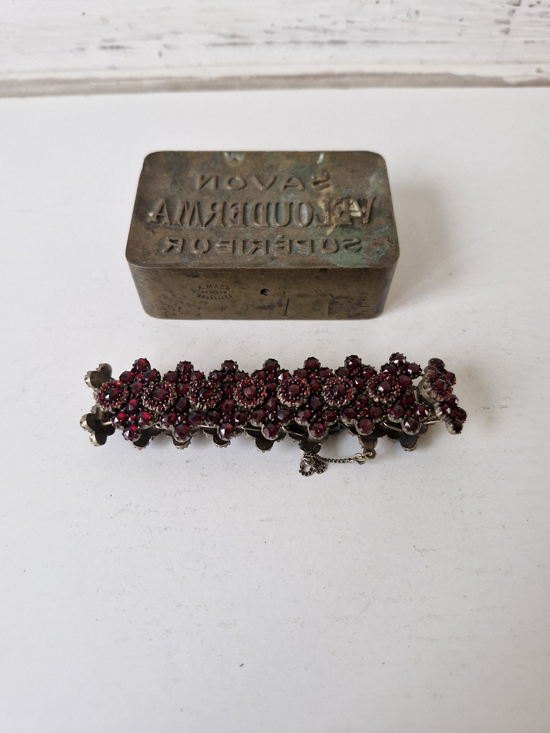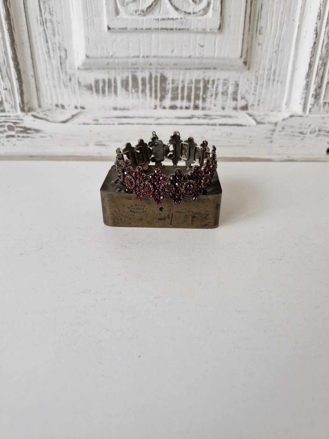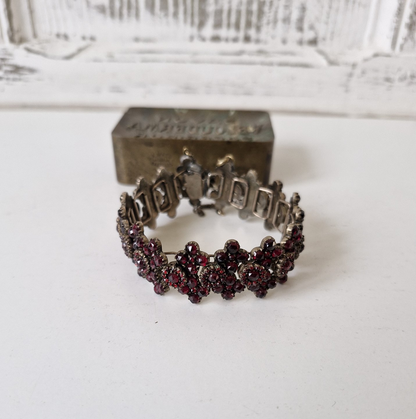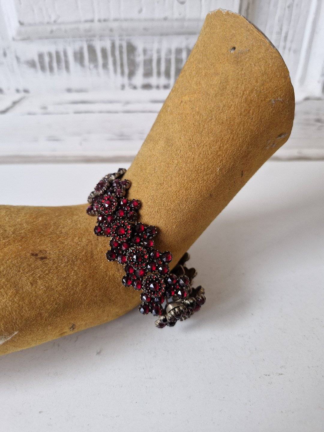 Very beautiful Victorian garnet bracelet. Circa 1860-80. Linked bracelet adorned with numerous beautiful dark garnets, the bracelet is equipped with safety chains.
