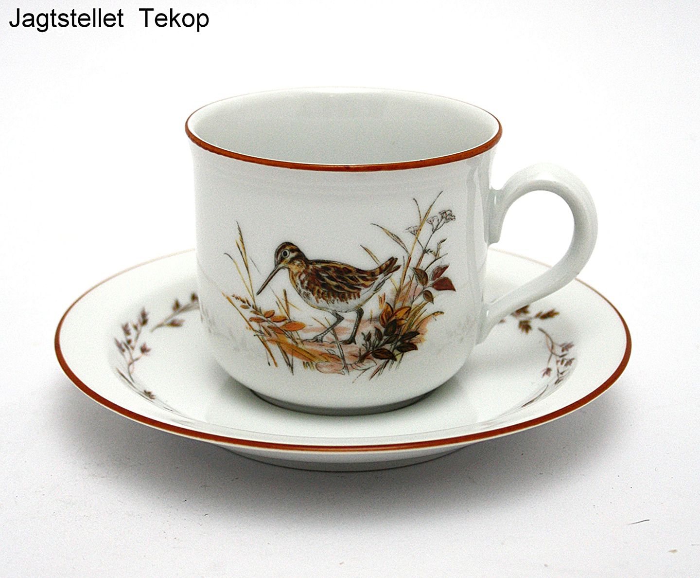 Jagtstellet designet af Mads Stage for Imerco. Tekop med underkop. Højde 7 cm. Diameter 8 cm. Underkop diameter 14,5 cm. Motiv Bekkasin. Pris: 150 kr. par. Lager: 6