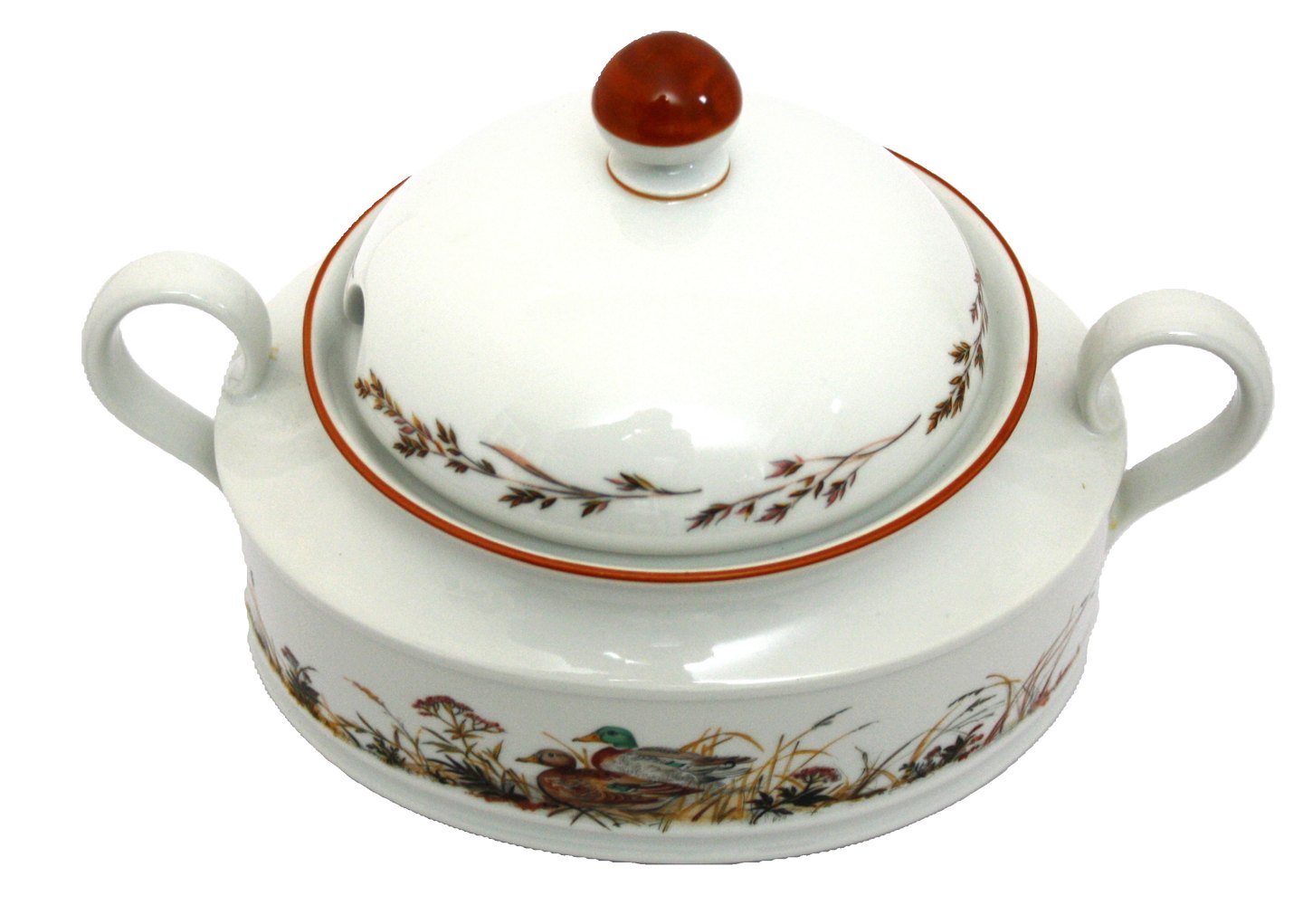 Jagtstellet designet af Mads Stage for Imerco. Ragoutfad med låg, Terrin med Gråand motiv. 2,2 ltr. Højde 18,5 cm. Bredde 19 cm. Længde 29 cm. Pris: 1100 kr. stk. Lager: 1