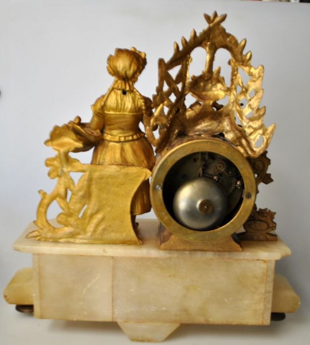 French gilded mantel clock in zinc, approx. 1870. With figure of a standing woman in rococo dress with a hat with flowers and a bird on her hand. Alabaster base with women in profile. Traditional standard clockwork with enamel dial with Roman numerals. H: 31 cm. W.: 31 cm. Included: bell, brush and key.