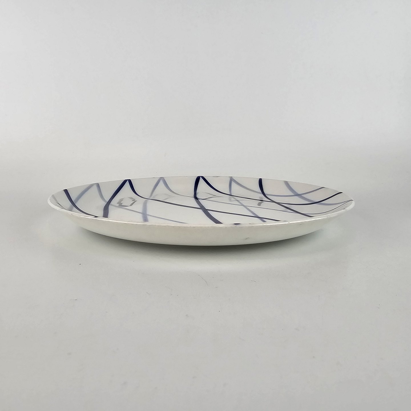 Blå Flamme er hvidt ildfast porcelæn, dekoreret med blå striber, der ligner flammer.