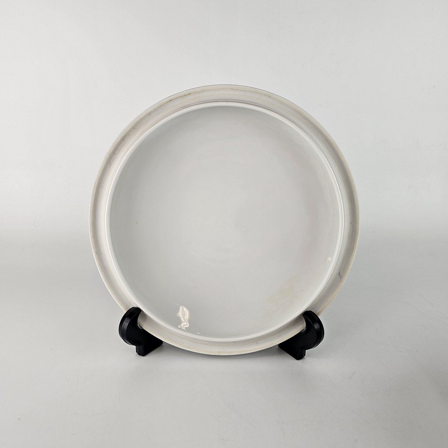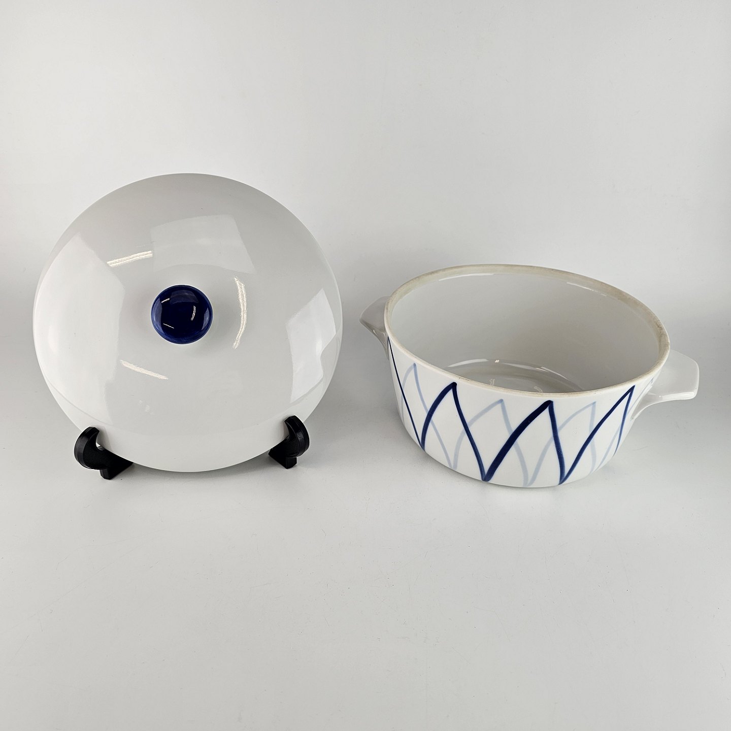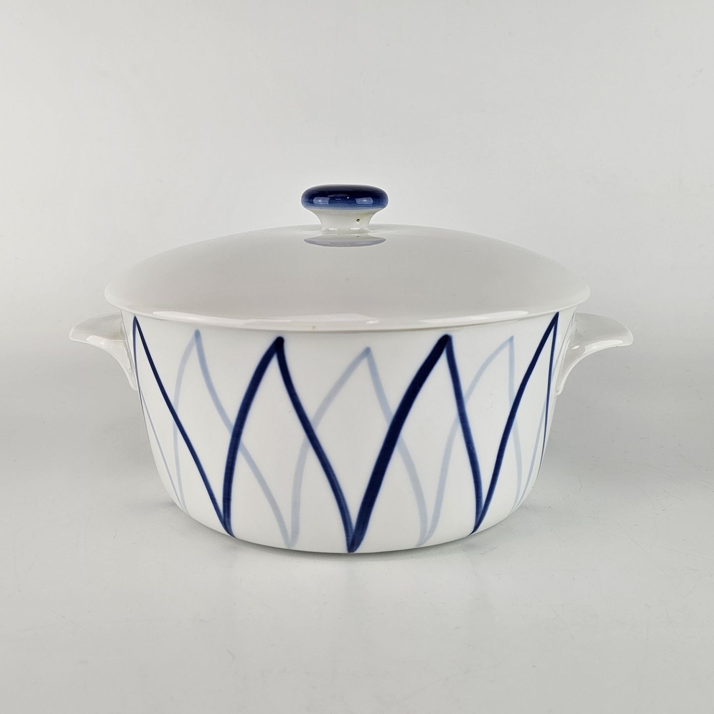 Blå Flamme er hvidt ildfast porcelæn, dekoreret med blå striber, der ligner flammer.