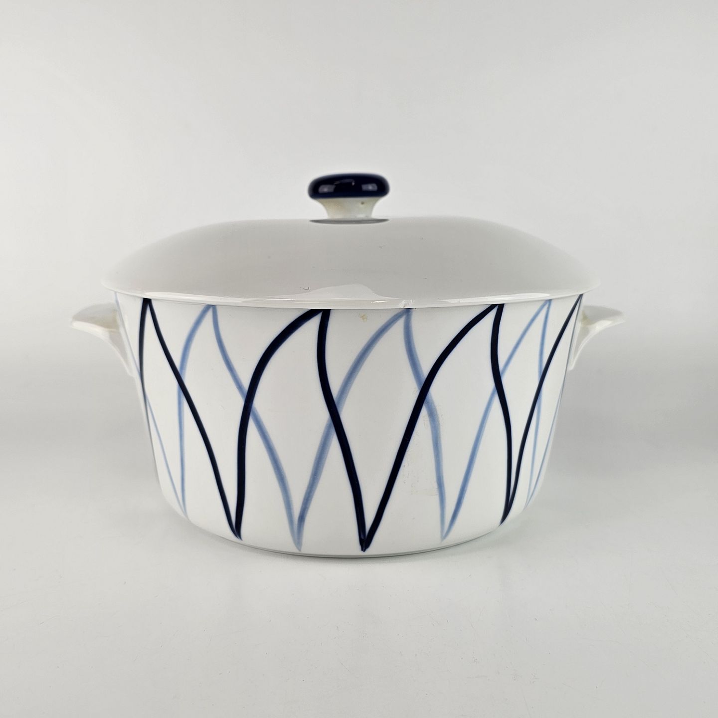 Blå Flamme er hvidt ildfast porcelæn, dekoreret med blå striber, der ligner flammer.