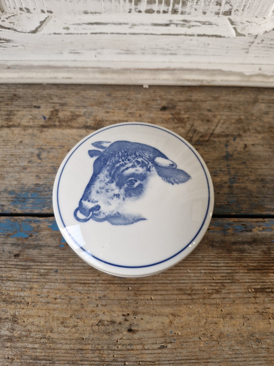 B&G lågskål lavet i anledningen af Fællesdyrskuet 1939, dekoreret med en tyr på låget |