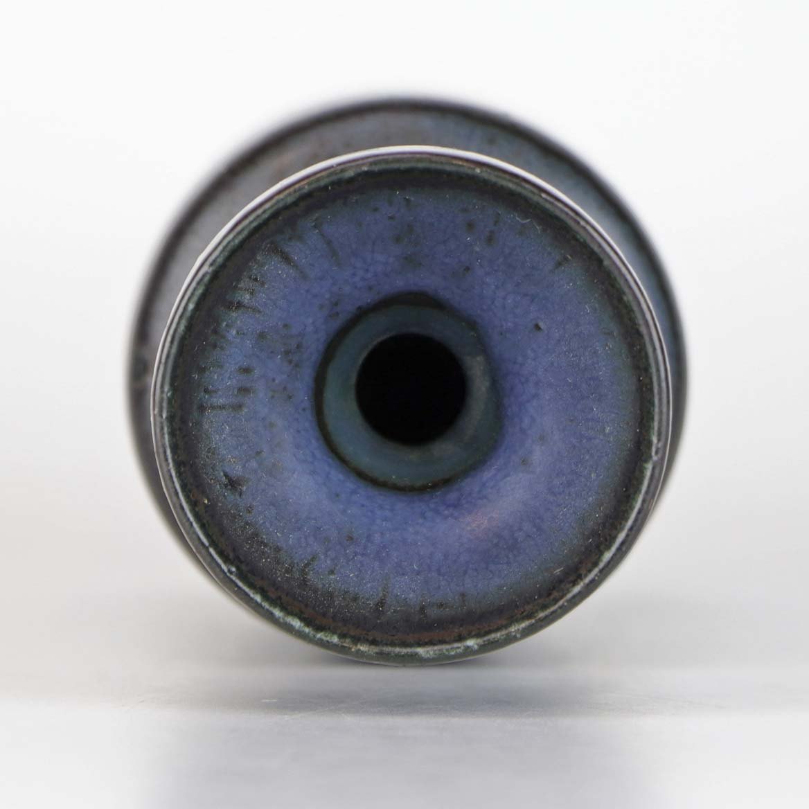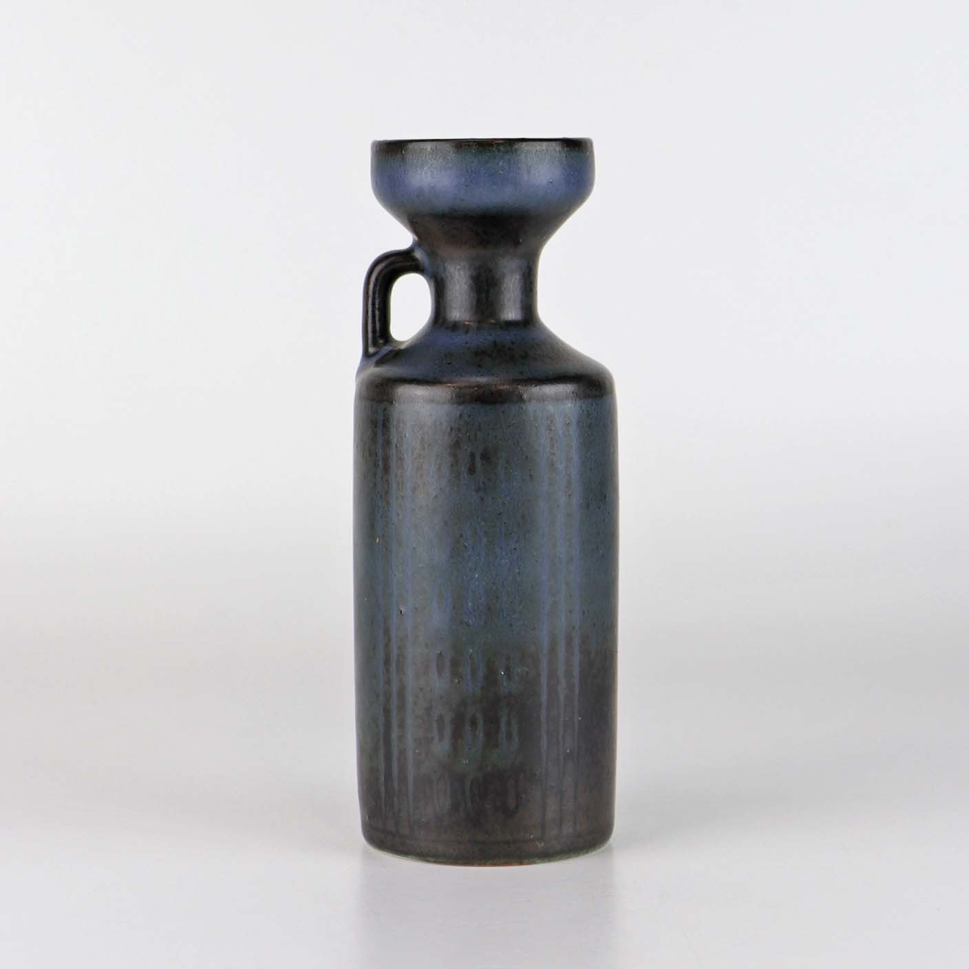 Vase i stentøj med hank med blåsort glasur samt abstrakt mønster af linjer og ovale cirkler.