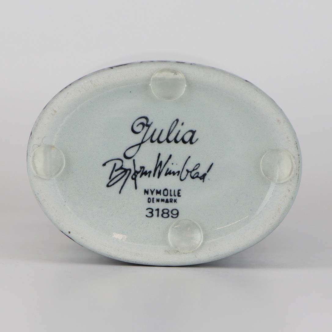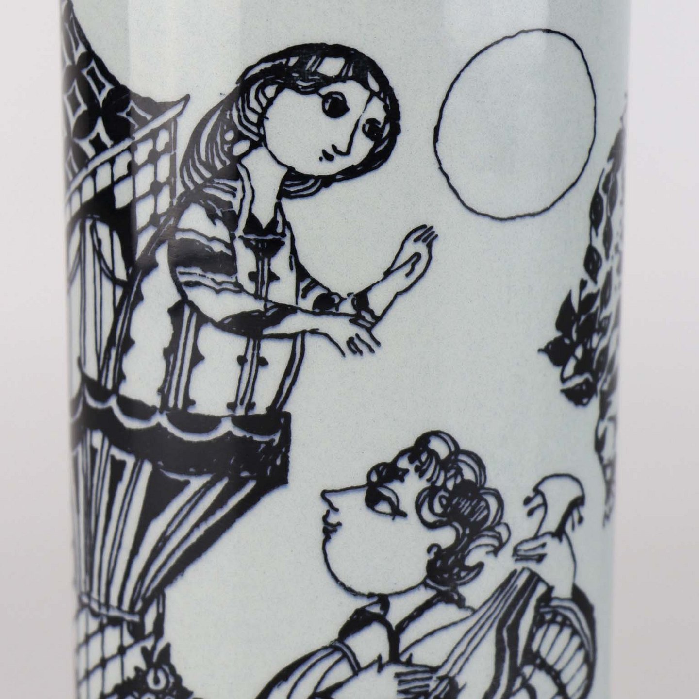 Oval vase i porcelæn med motiv i sort streg af kvinde på balkon med syngende mand og titlen Julia. Nr. 3189