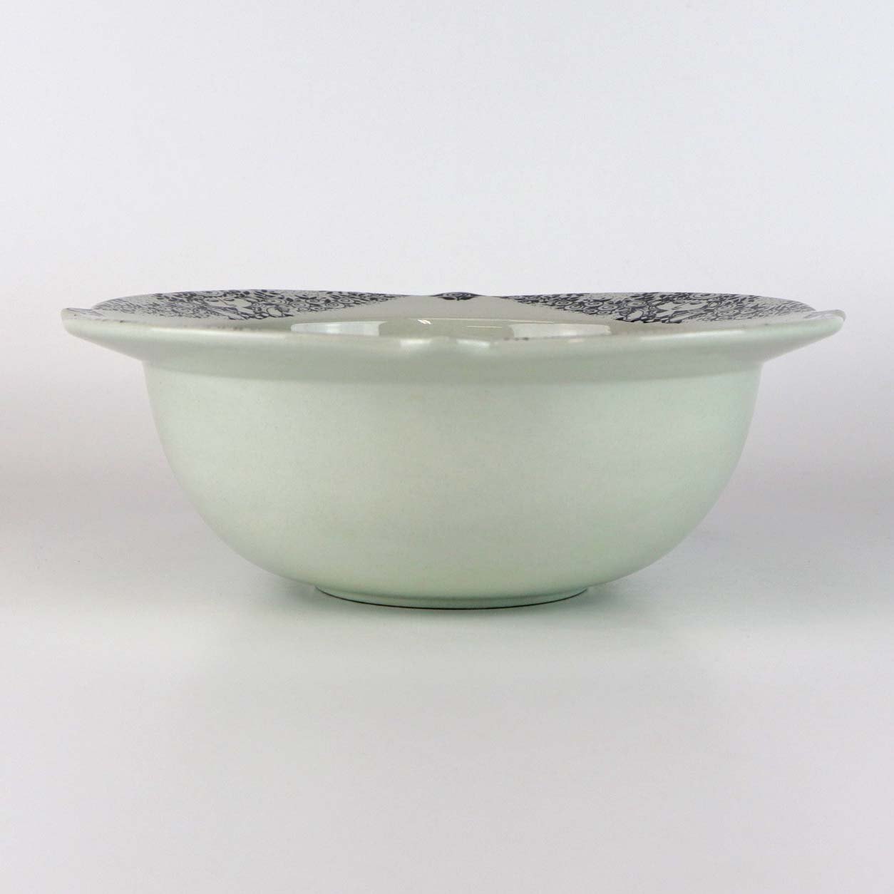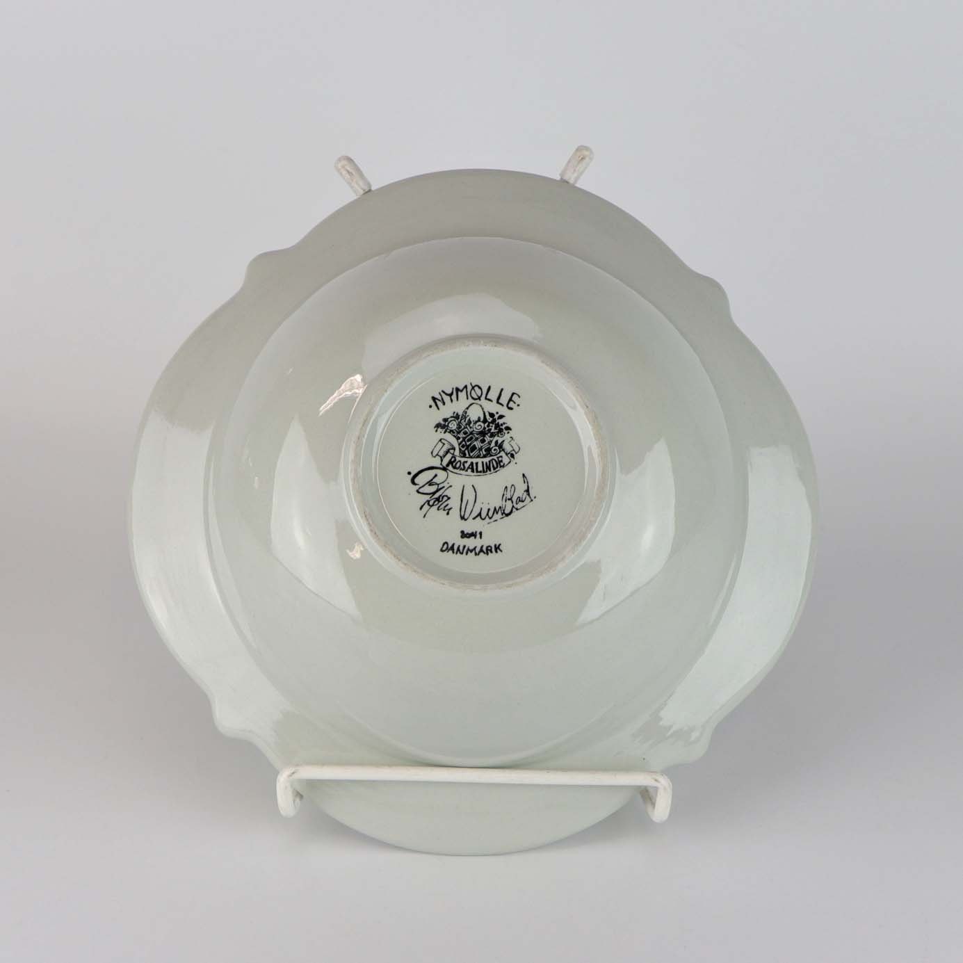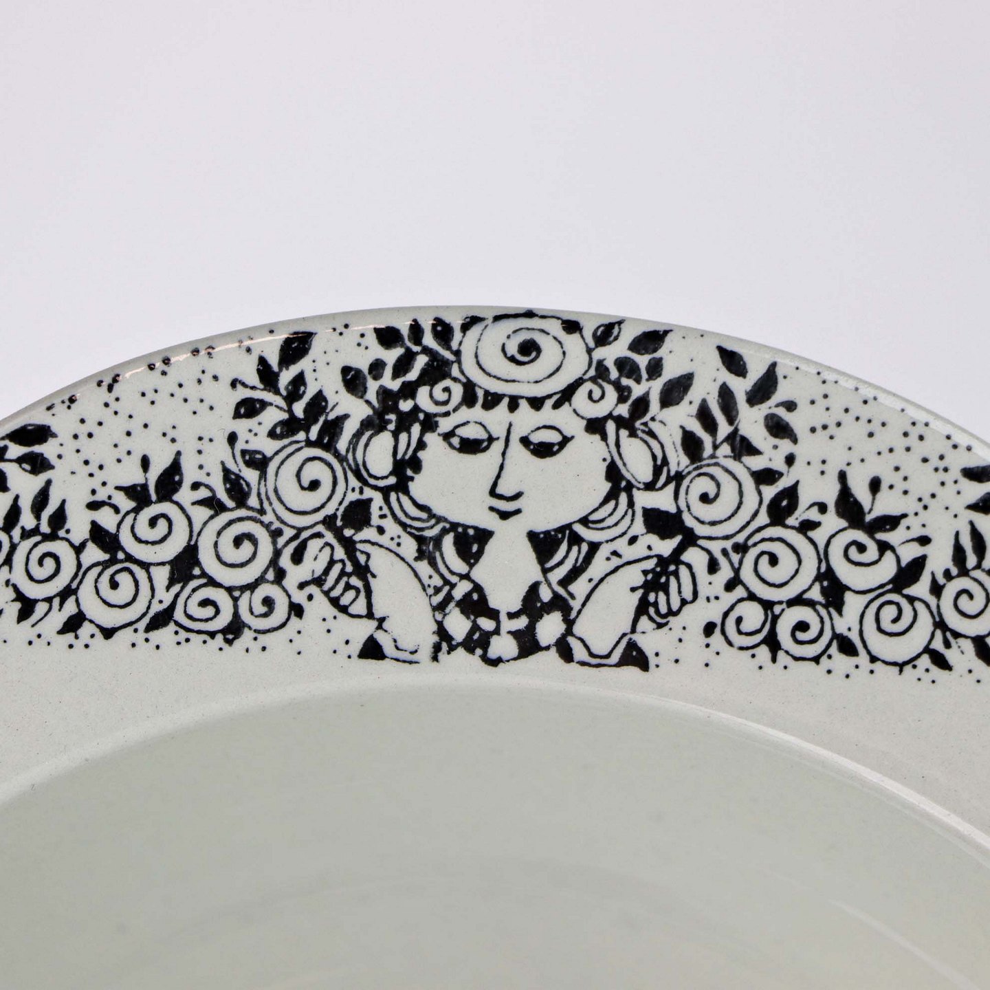 Kantet skål i porcelæn med motiv i sort streg af kvinde og med titlen Rosalinde. Nr. 3041