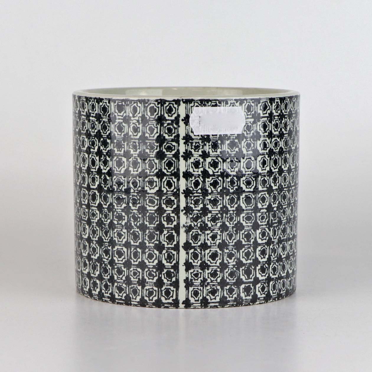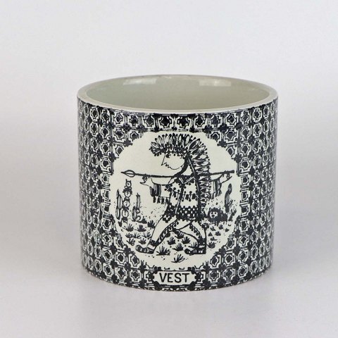 Urtepotteskjuler i porcelæn med motiv i sort streg af indianer samt titlen Vest. Nr. 3022-697