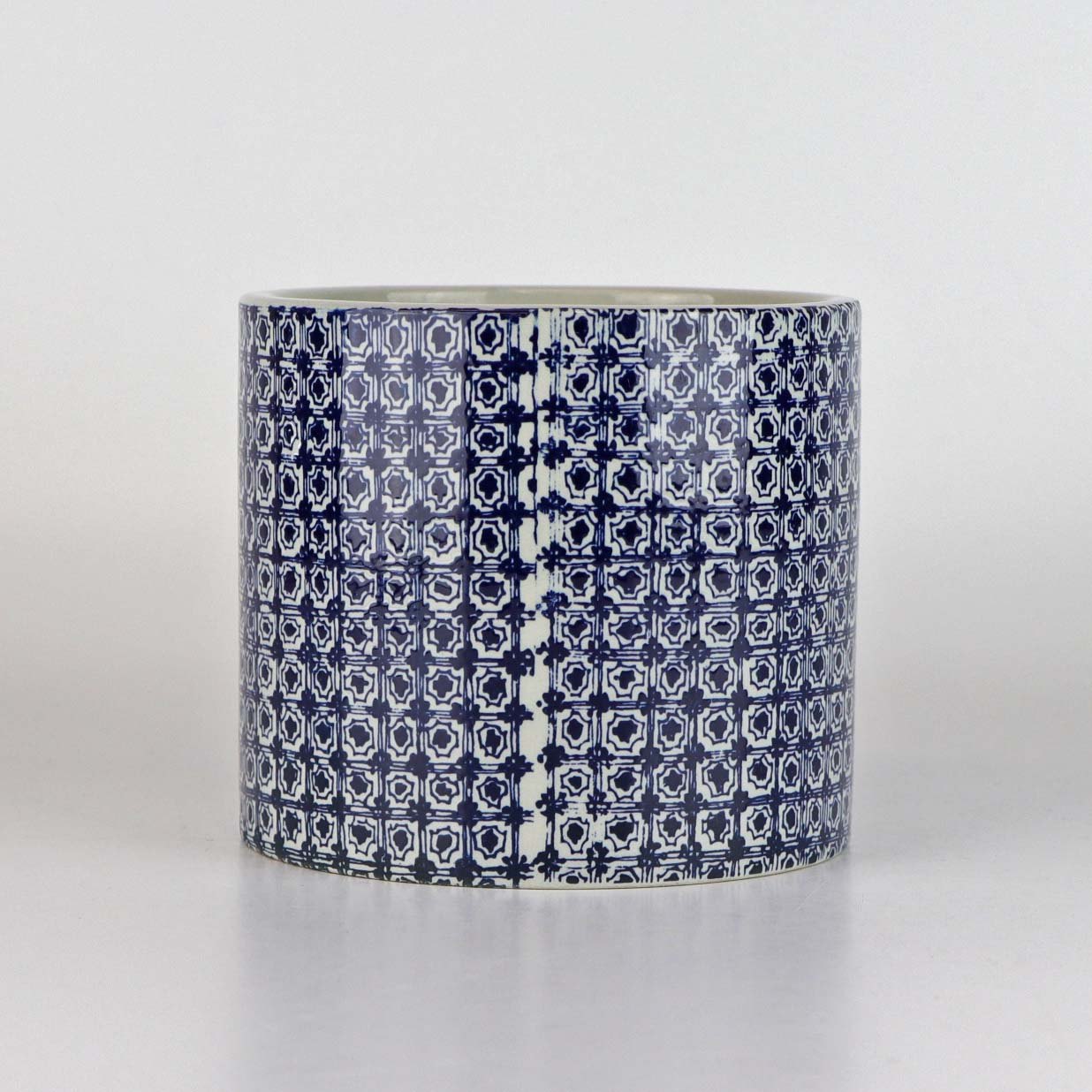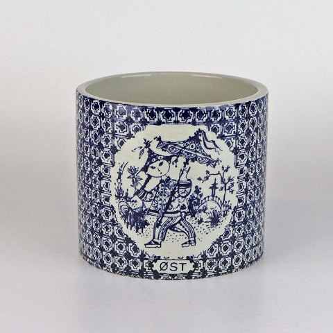 Urtepotteskjuler i porcelæn med motiv i blå streg af kineser samt titlen Øst. Nr. 3022-697