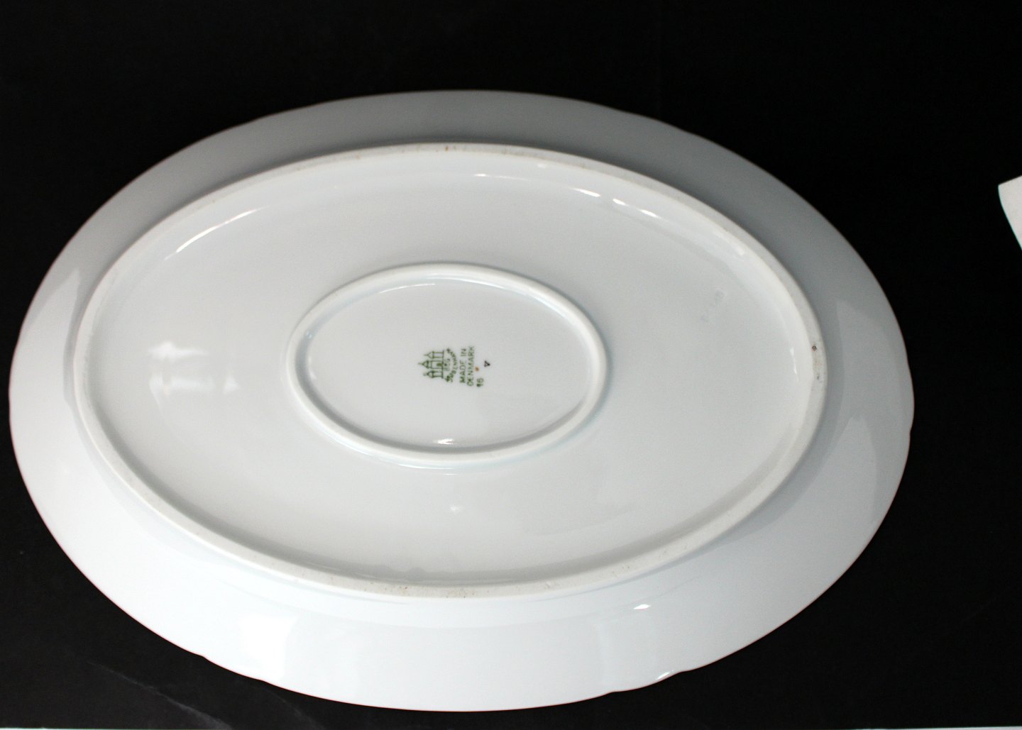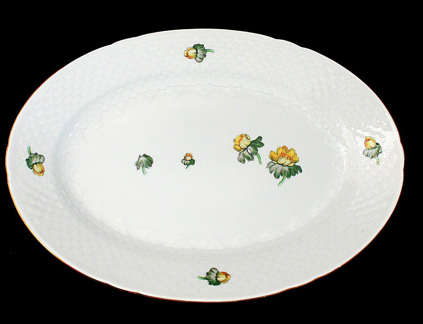 Text available in Danish: Bing & Grøndahl, Erantis, Serveringsfad, Stegefad. Nr. 16. 34,5 x 23,5 cm. I. sortering. Fin stand med minimal slitage på guldkant. Pris: 325 kr. stk. Lager: 2