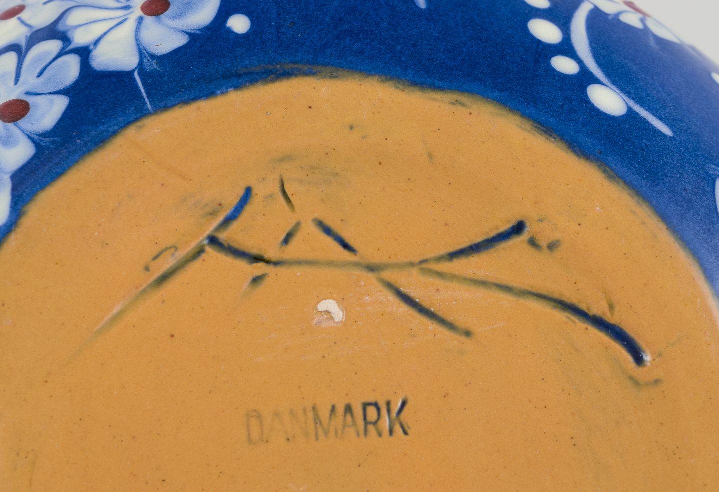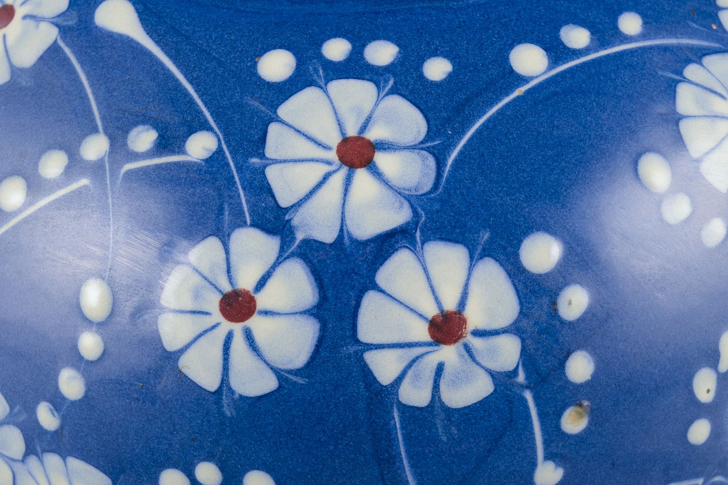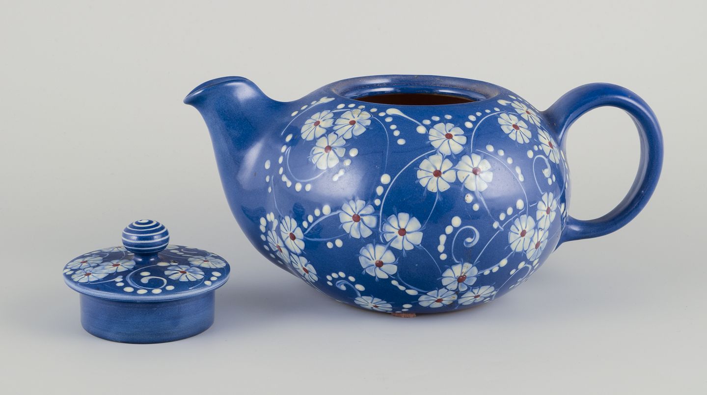 Stor ”Marguerite” tekande med blå glasur, dekoreret med hvide blomster.