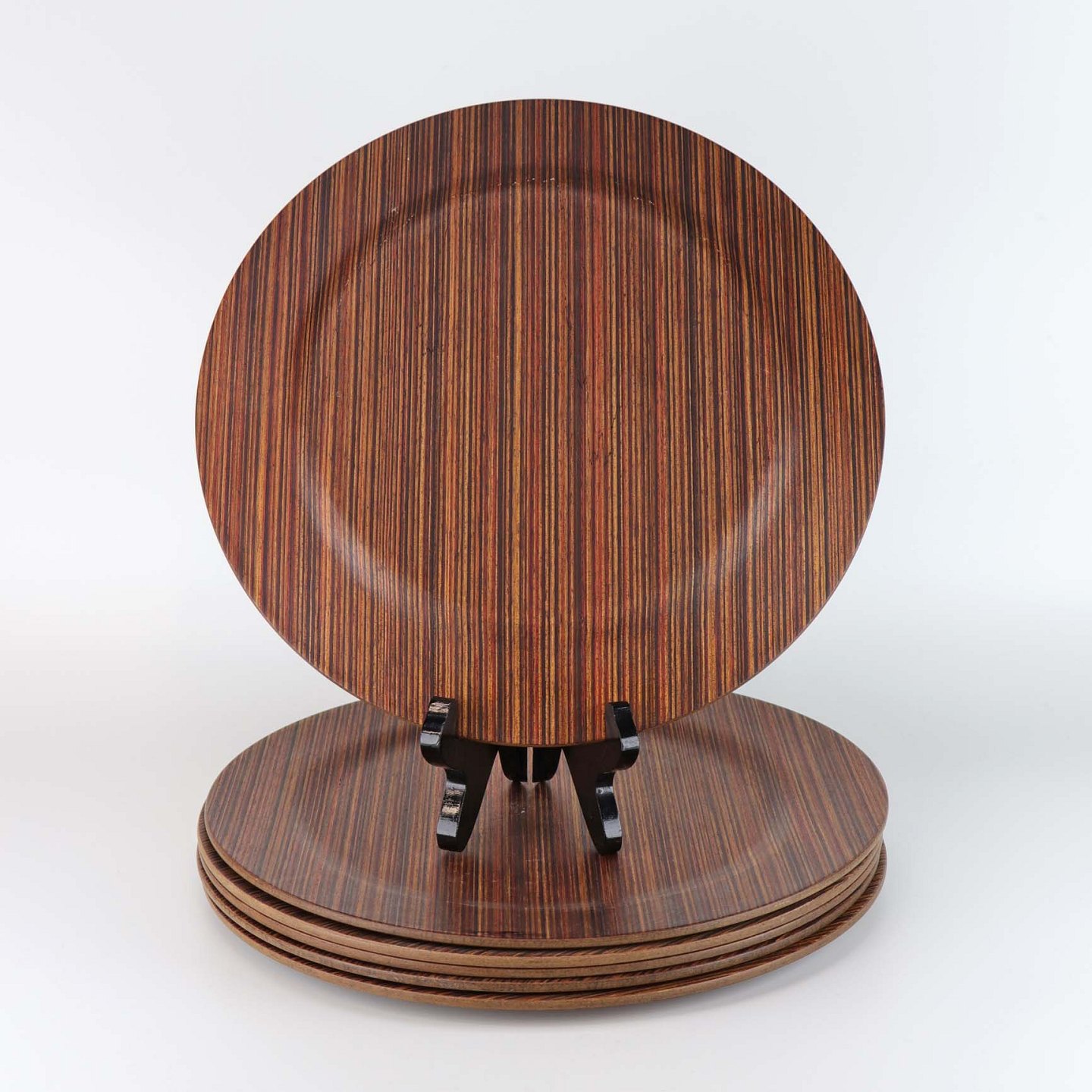 Et sæt med seks styk dækketallerkner i træ med stribet mønster i forskellige nuancer
