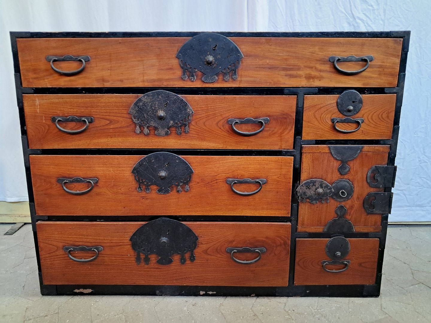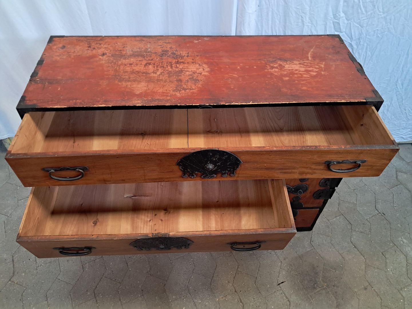 Malet kommode i massivt træ med fronter i elmetræ, fra 1930erne.
