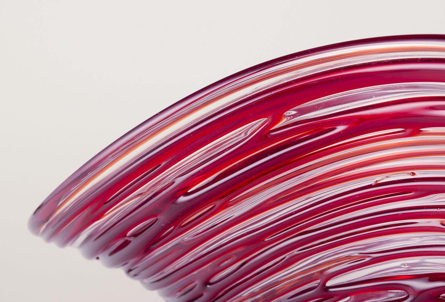 Kolossal unika bordskål af glas, prydet med horisontale røde glasdekorationer i relief. Håndlavet.