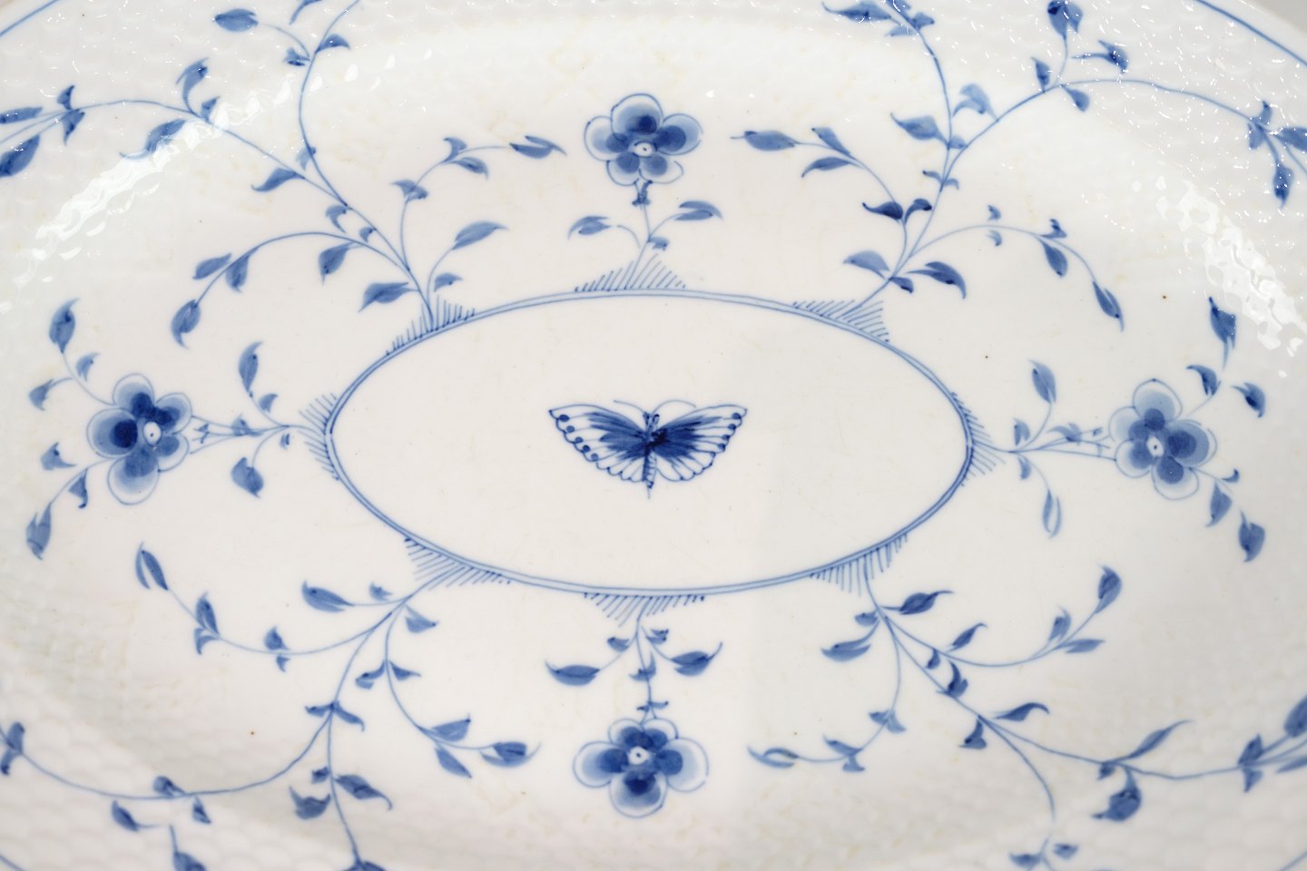 Stort ovalt fad, nr. 26, fra Bing & Grøndahl. Udført i porcelæn med håndmalet sommerfuglmotiv, med stempel i bunden.