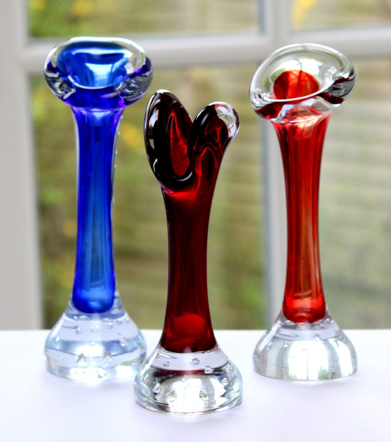 Text available in Danish: Åseda/Aseda Glasbruk, Sweden, Knoglevaser forskellige farver med klar fod med bobler. Antagelig designet af Bo Borgström.