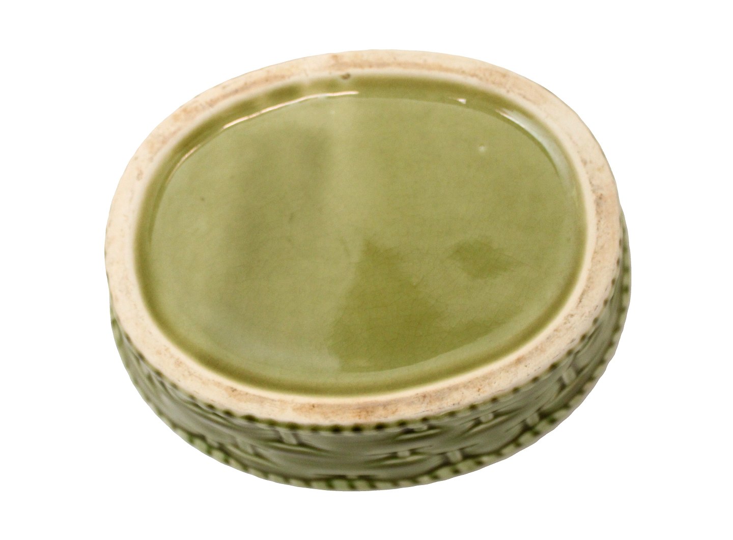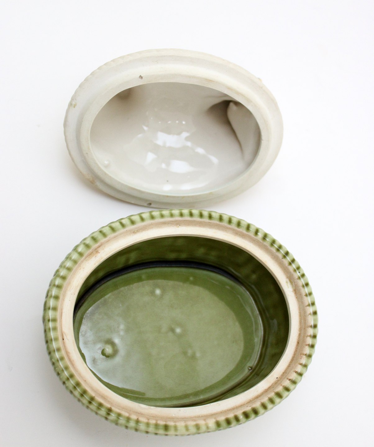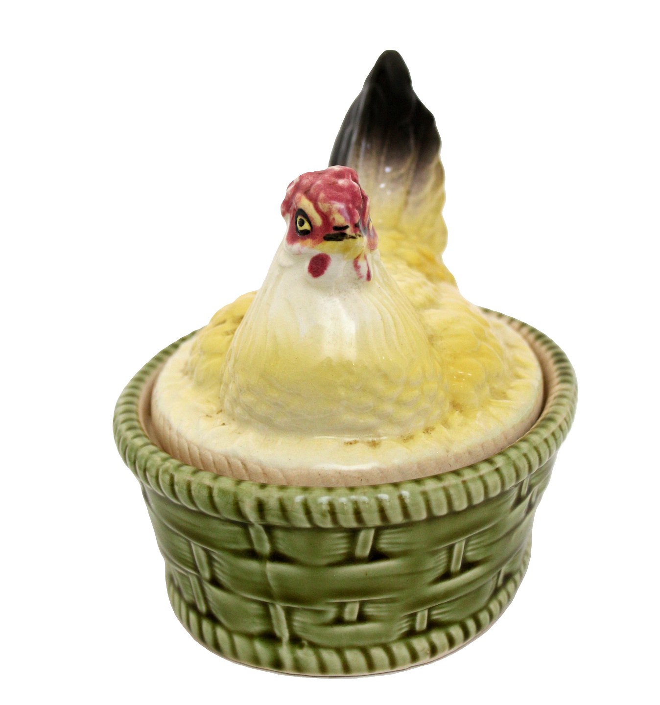 Skøn gul æggehøne i grøn flettet kurv udført i fajance. Højde 14 cm. Længde 16 cm. Flot stand med lettere overfladekrakelering. Pris: 525 kr.