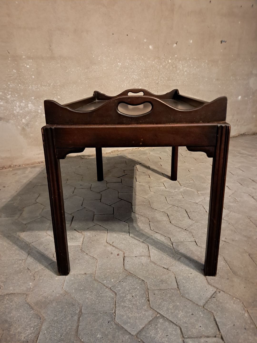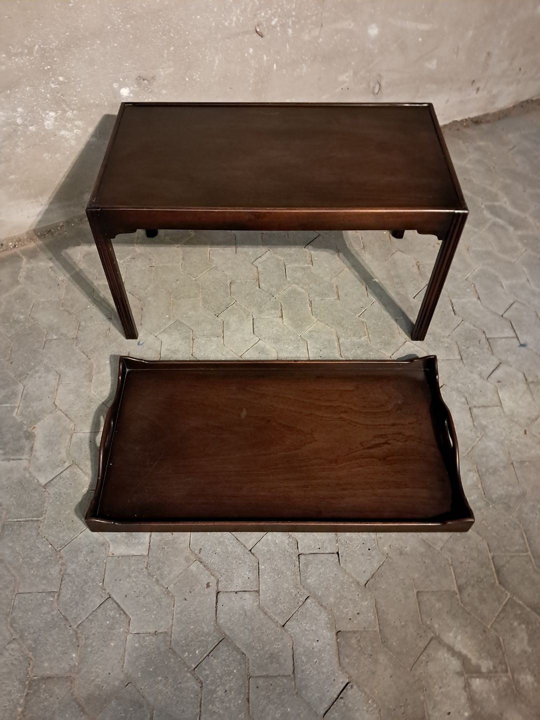 Bakkebord i fineret mahogni, fra 1980erne.