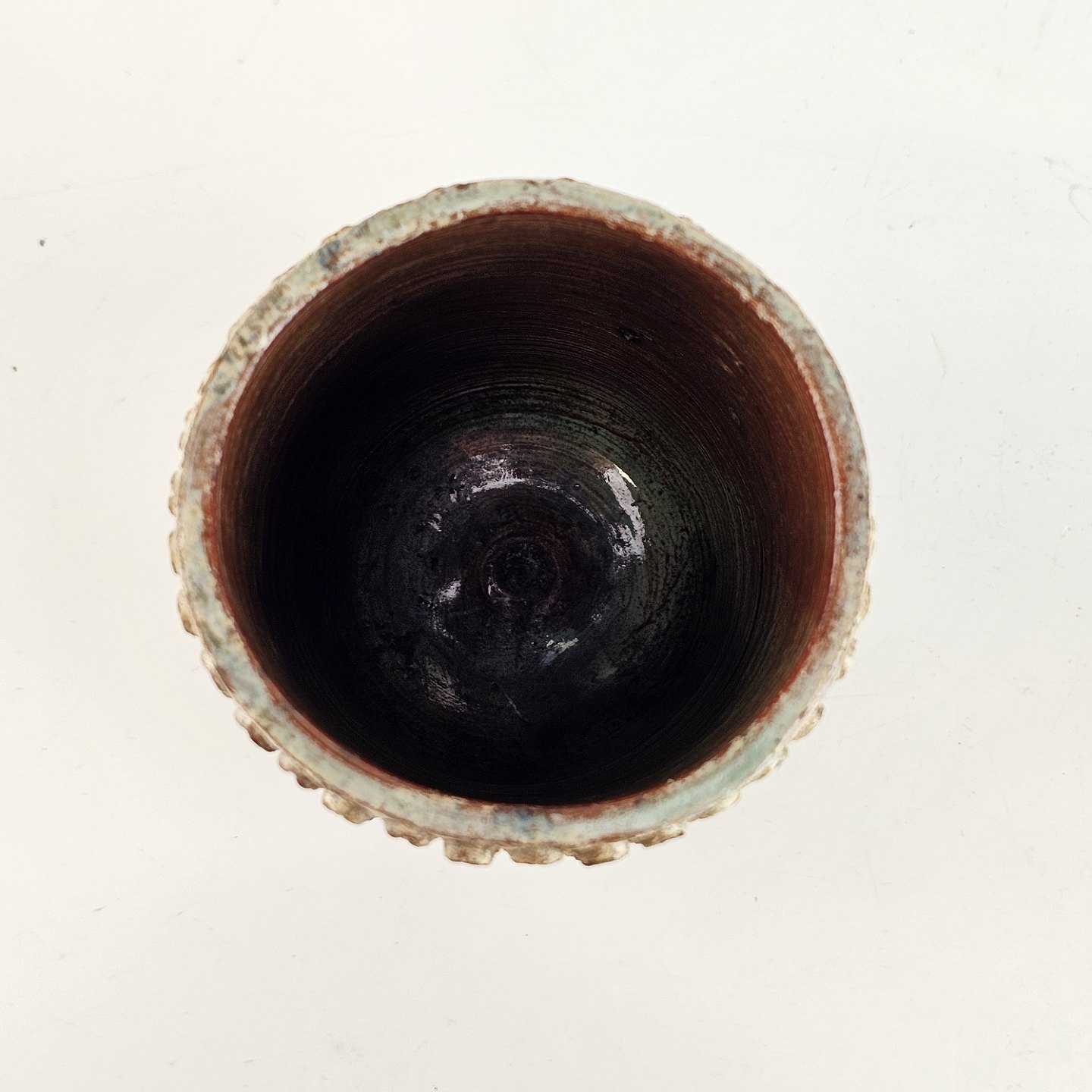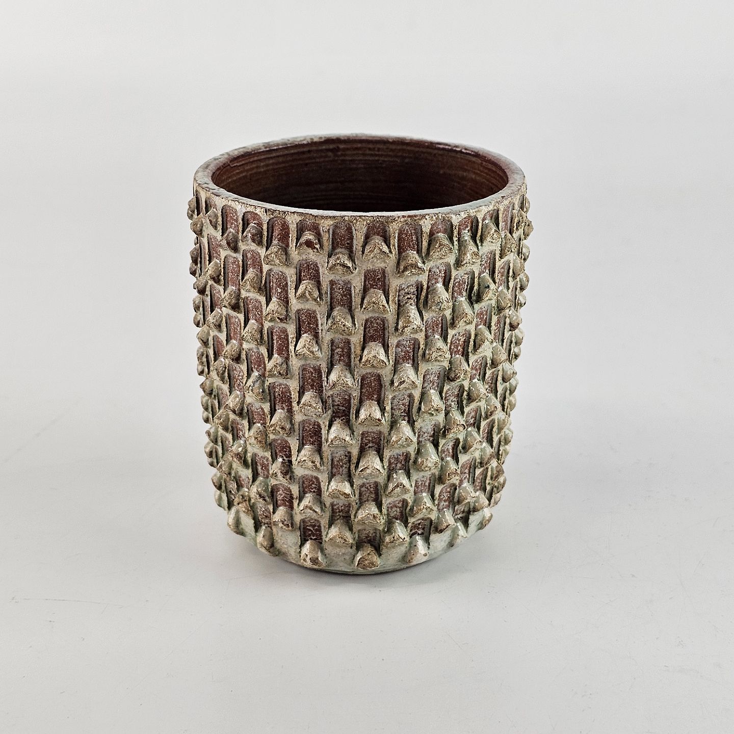 Lille nopret krukke, i brune nuancer.