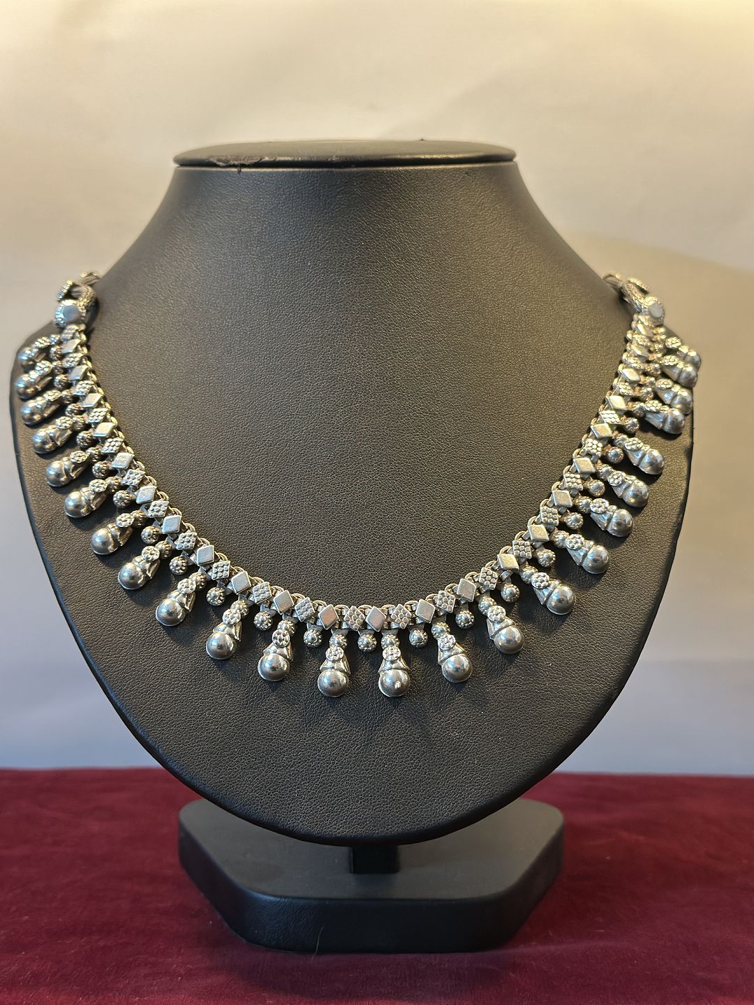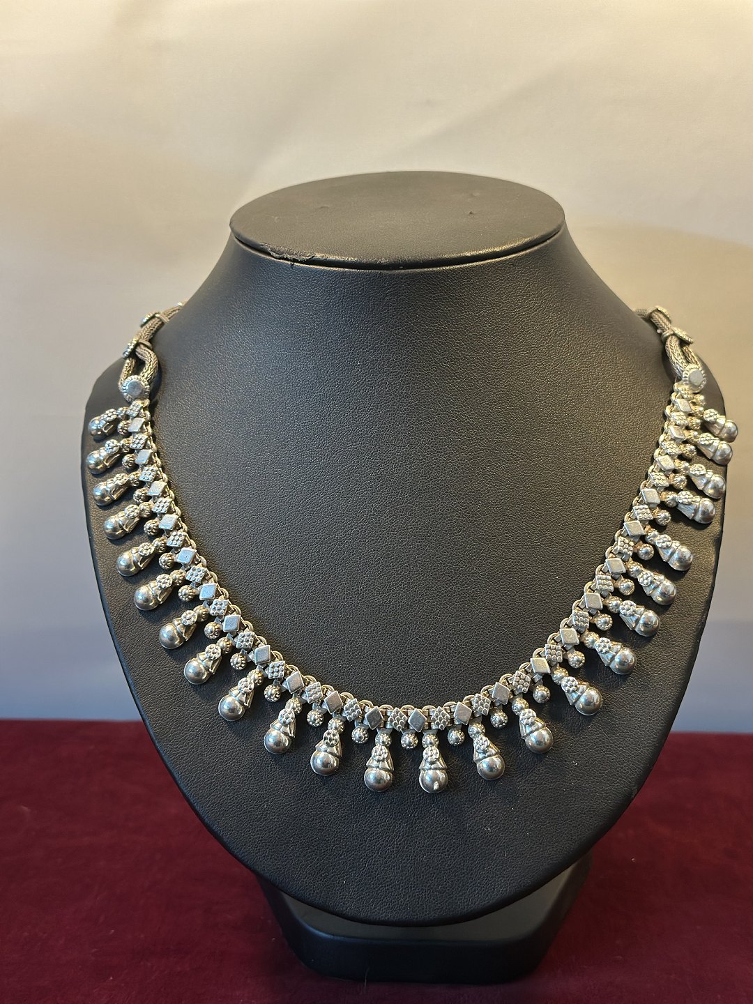Vintage, unik sølvhalskæde med spiralmønster fra det 17. århundrede. Sjælehalskæde lavet af sølv fra 800-tallet, længde 43 cm, bredde 17 cm, pæn og pæn stand.