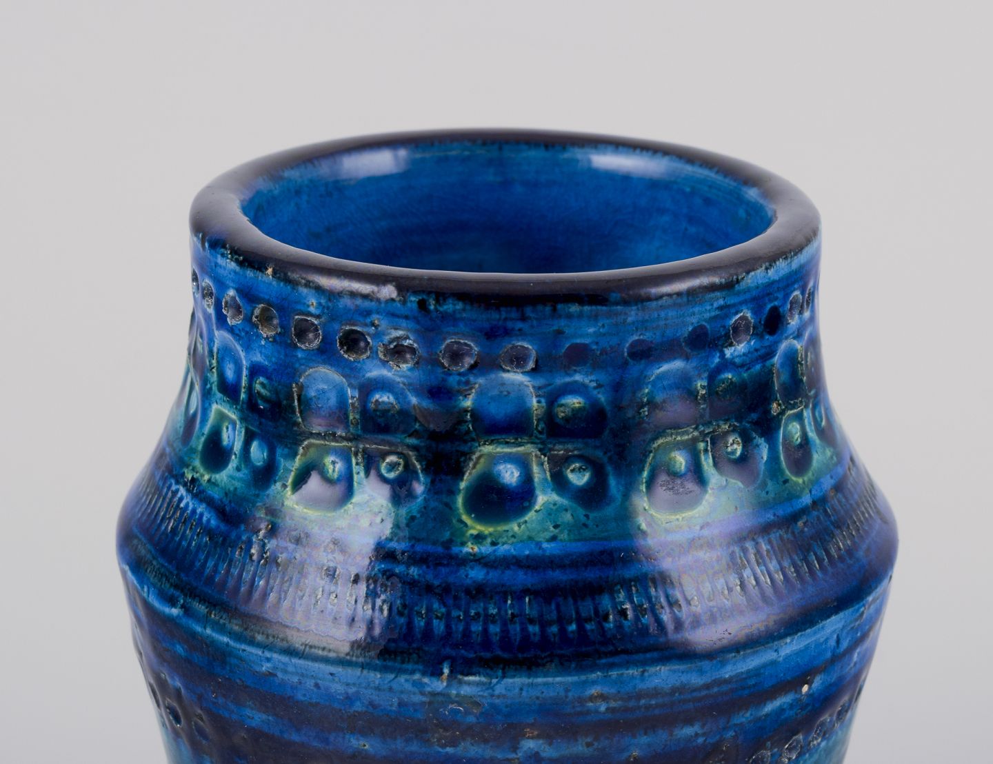 Aldo Londi for Bitossi. Vase in Rimini blue glazed ceramic with geometric patterns.