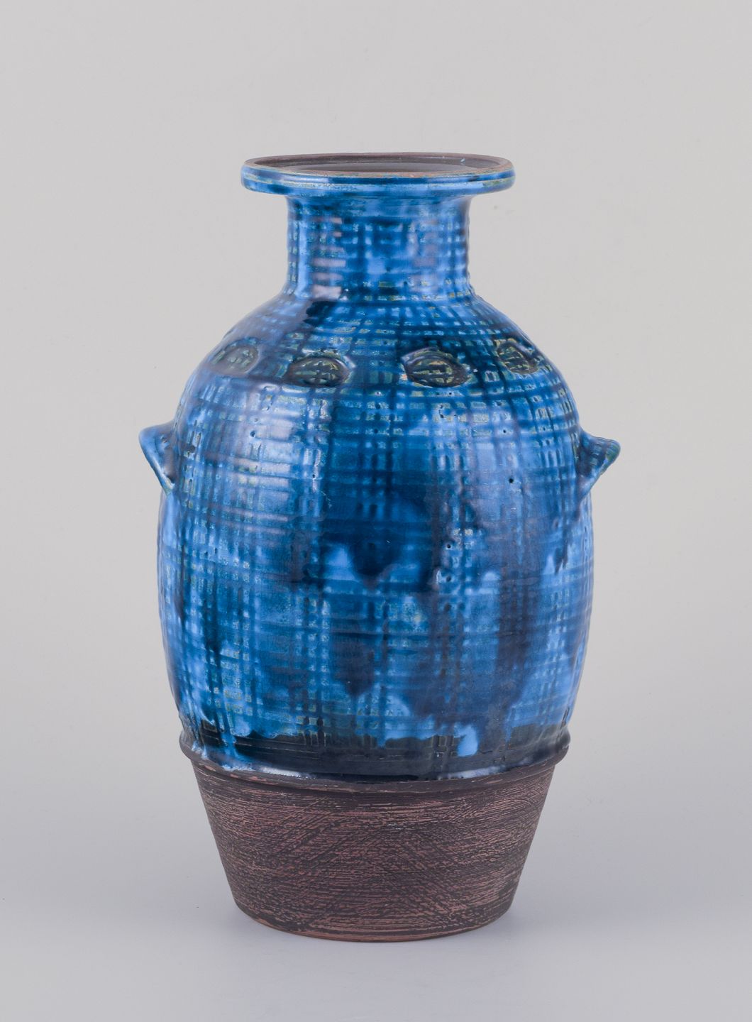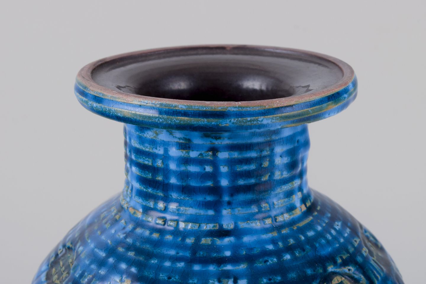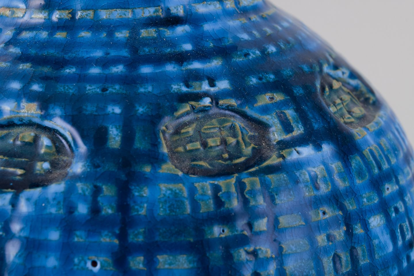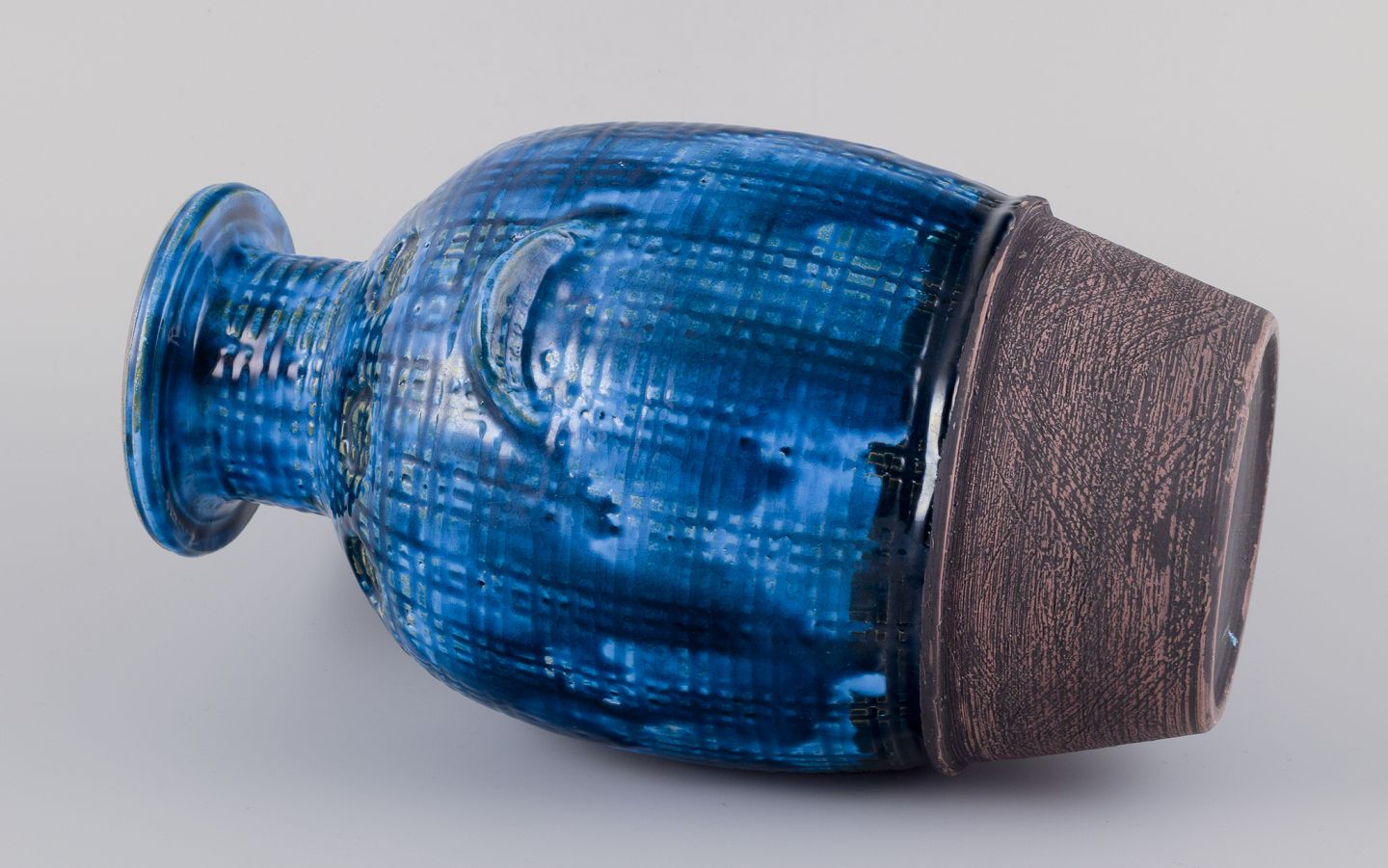 Aldo Londi for Bitossi. Vase i Rimini-blå glaseret keramik med geometriske mønstre.