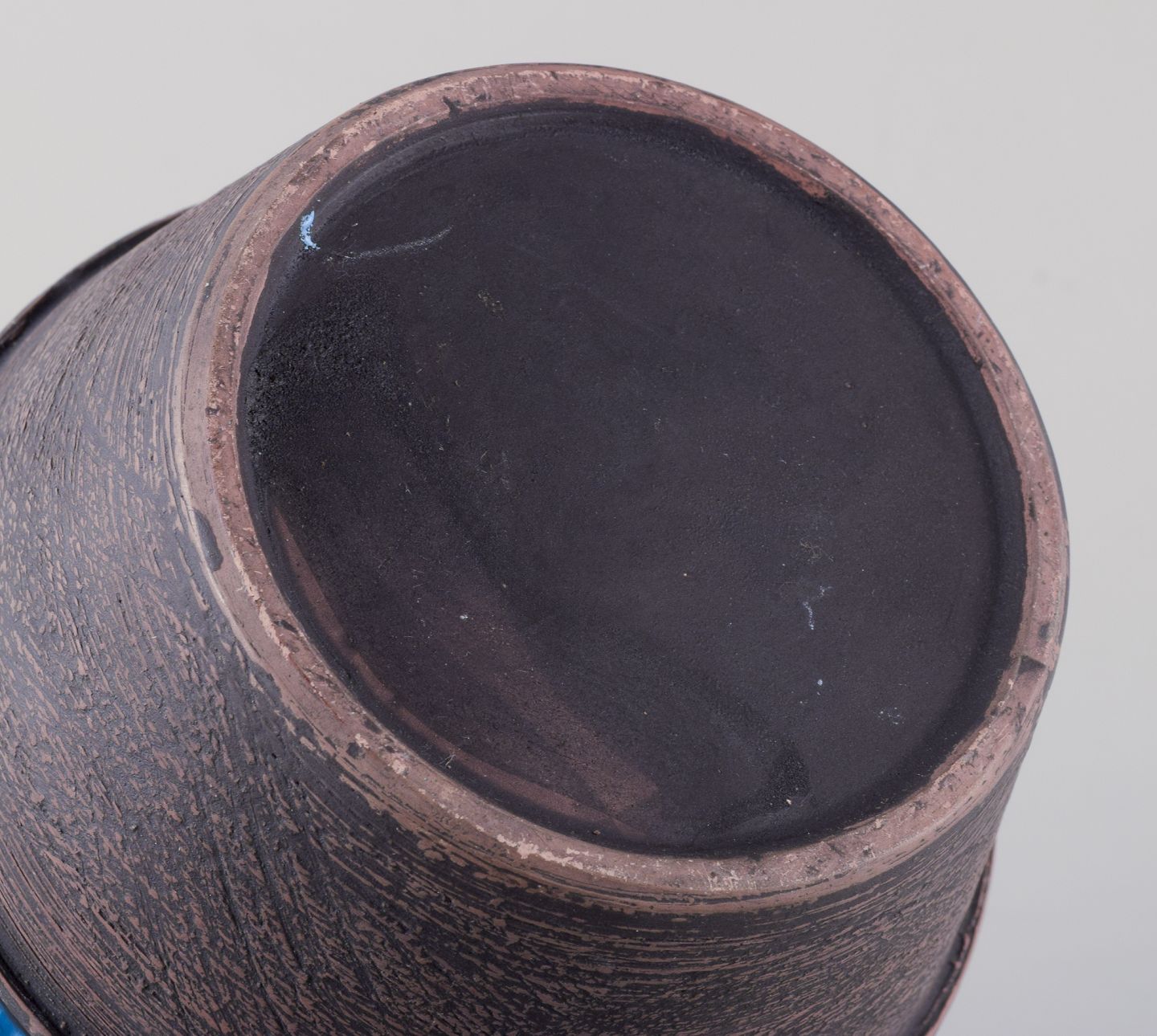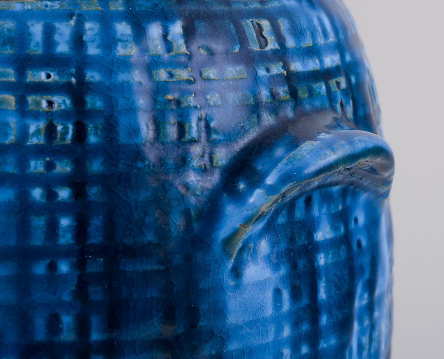 Aldo Londi for Bitossi. Vase i Rimini-blå glaseret keramik med geometriske mønstre. Klassisk form med hanke.