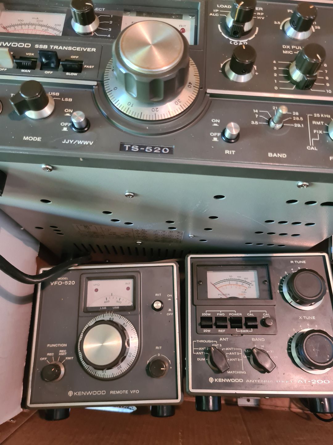 Flyttekasse med utestet Kenwood radioudstyr. TS-520 tænder og lysene virker, men har ikke været testet udover det eller sammen med de andre dele i kassen. Alt på billederne medfølger.